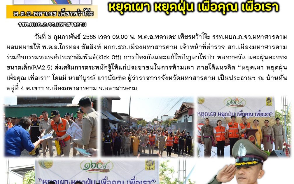 🔸พร้อมด้วยเจ้าหน้าที่ตำรวจ สภ.เมืองมหาสารคาม ร่วมกิจกรรมรณรงค์ประชาสัมพันธ์(Kick Off) การป้องกันและแก้ไขปัญหาไฟป่า หมอกควัน และฝุ่นละอองขนาดเล็ก(PM2.5) ส่งเสริมการตระหนักรู้ให้แก่ประชาชนในการห้ามเผา ภายใต้แนวคิด “หยุดเผา หยุดฝุ่น เพื่อคุณ เพื่อเรา” โดยมี นายวิบูรณ์ แววบัณฑิต ผู้ว่าราชการจังหวัดมหาสารคาม เป็นประธานฯ ณ บ้านหัน หมู่ที่ 4 ต.เขวา อ.เมืองมหาสารคาม จ.มหาสารคาม