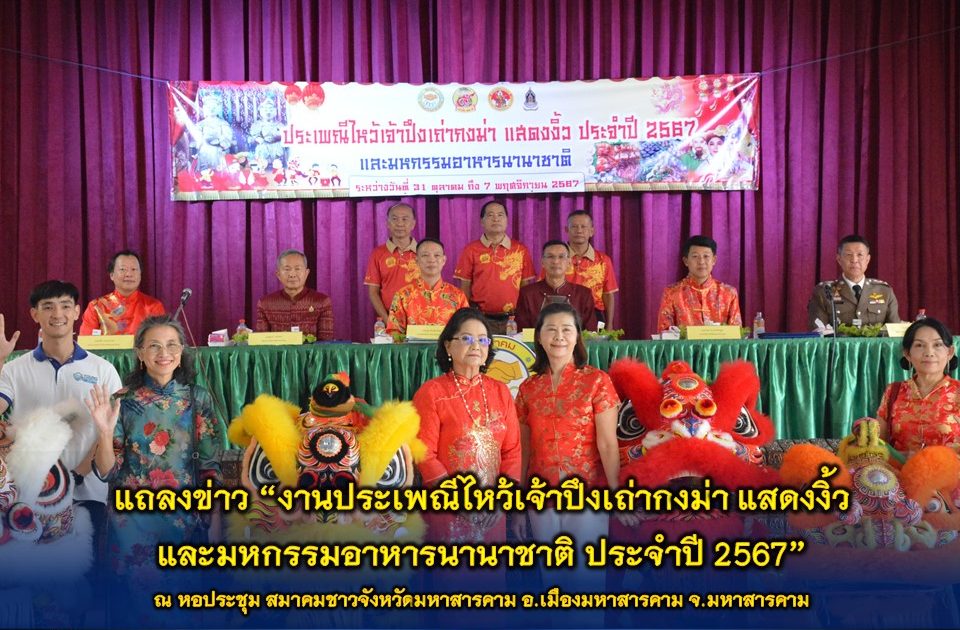 ร่วมแถลงข่าว “งานประเพณีไหว้เจ้าปึงเถ่ากงม่า แสดงงิ้ว และมหกรรมอาหารนานาชาติ ประจำปี 2567” กำหนดจัดขึ้นในช่วงวันที่ 31 ตุลาคม 2567 – 7 พฤศจิกายน 2567 ภายในงานได้จัดให้มี “ตลาดงานงิ้ว” เป็นตลาดไนท์มาร์เก็ต ซึ่งจะเป็นตลาดคนเดินที่มีร้านอาหารมาจากทั่วทุกภาค นำมาจำหน่าย บนถนนนครสวรรค์ มีร้านค้ากว่า 1,000 ร้านค้า ความยาวของตลาด กว่า 1 กิโลเมตร ซึ่งเป็นการสร้างรายได้ให้กับพ่อค้าแม่ค้าในแต่ละปี นับเป็น การกระตุ้นเศรษฐกิจ ของพี่น้องประชาชนภายในจังหวัด และภายในงานยังมีการเปิดโอกาสให้เยาวชน นักเรียน นักศึกษา ได้แสดงความสามารถในด้านต่าง ๆ อาทิ การแข่งขันแสดงดนตรี ชิงถ้วยรางวัล ตลอดจนมีกิจกรรม มากมาย ณ ที่หอประชุม สมาคมชาวจังหวัดมหาสารคาม