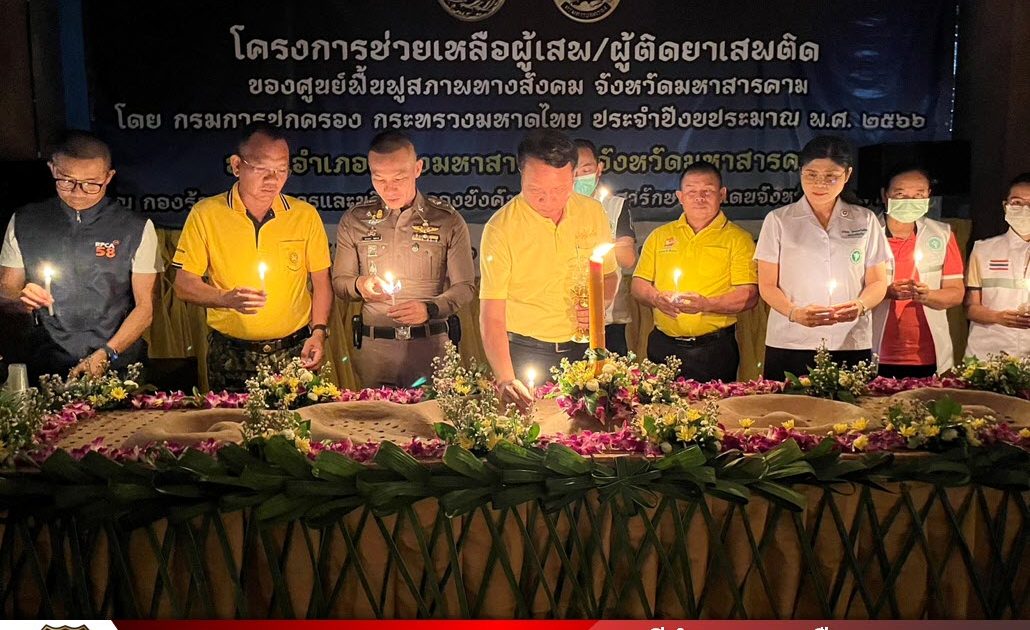 ร่วมกิจกรรมจุดเทียนอุดมการณ์ คืนคนดีสู่สังคม ตาม “โครงการช่วยเหลือผู้เสพ/ผู้ติดยาเสพติด ของศูนย์ฟื้นฟูสภาพทางสังคม อำเภอเมืองมหาสารคาม รุ่นที่ 1 ประจำปี 2566” ณ กองร้อยบังคับการและบริการ กองบังคับการกองอาสารักษาดินแดนจังหวัดมหาสารคาม โดยจัดกิจกรรมนี้ขึ้น เพื่อสร้างขวัญกำลังใจให้แก่ผู้เข้ารับการบำบัดฟื้นฟูในการปรับเปลี่ยนพฤติกรรมไม่กลับไปยุ่งเกี่ยวกับยาเสพติด และสร้างแรงจูงใจในการปรับเปลี่ยนพฤติกรรมให้สามารถอยู่ร่วมกับชุมชน และสังคมอย่างเหมาะสม โดยมี นายนันทวิทย์ นาคแสง นายอำเภอเมืองมหาสารคาม เป็นประธานในพิธี