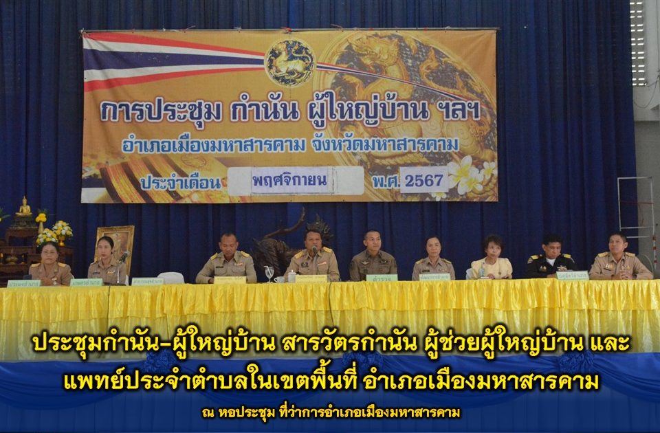 พร้อมหัวหน้าส่วนราชการ เจ้าหน้าที่ผู้เกี่ยวข้องร่วมประชุมกำนัน-ผู้ใหญ่บ้าน สารวัตรกำนัน ผู้ช่วยผู้ใหญ่บ้าน และแพทย์ประจำตำบลในเขตพื้นที่ อำเภอเมืองมหาสารคาม ประจำเดือน พฤศจิกายน 2567 ณ หอประชุม ที่ว่าการอำเภอเมืองมหาสารคาม