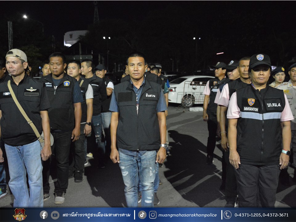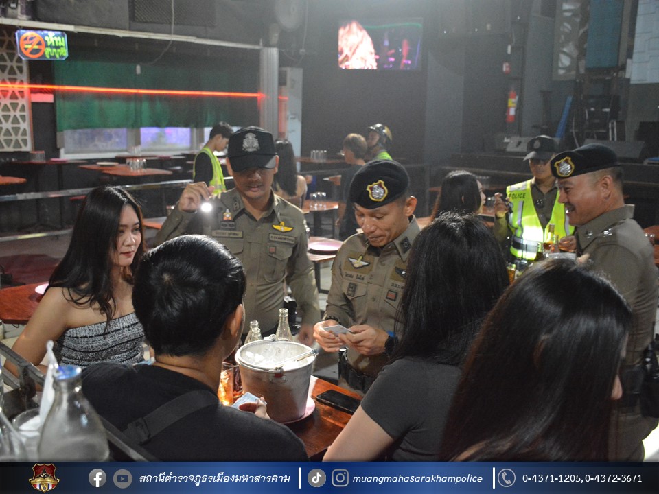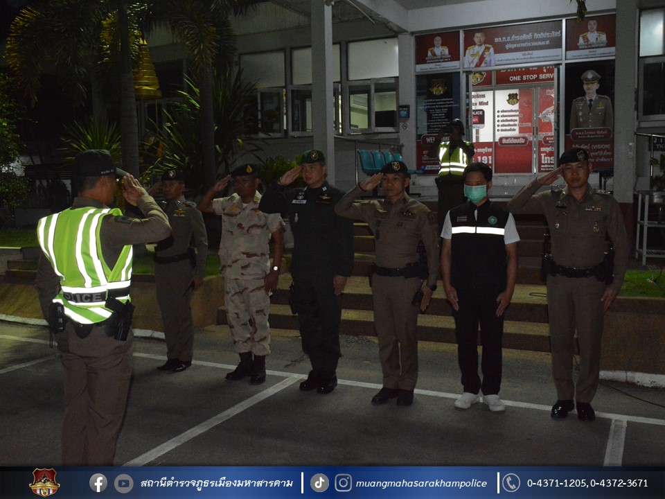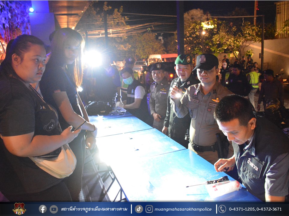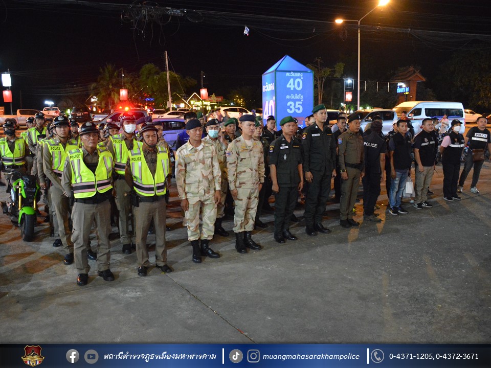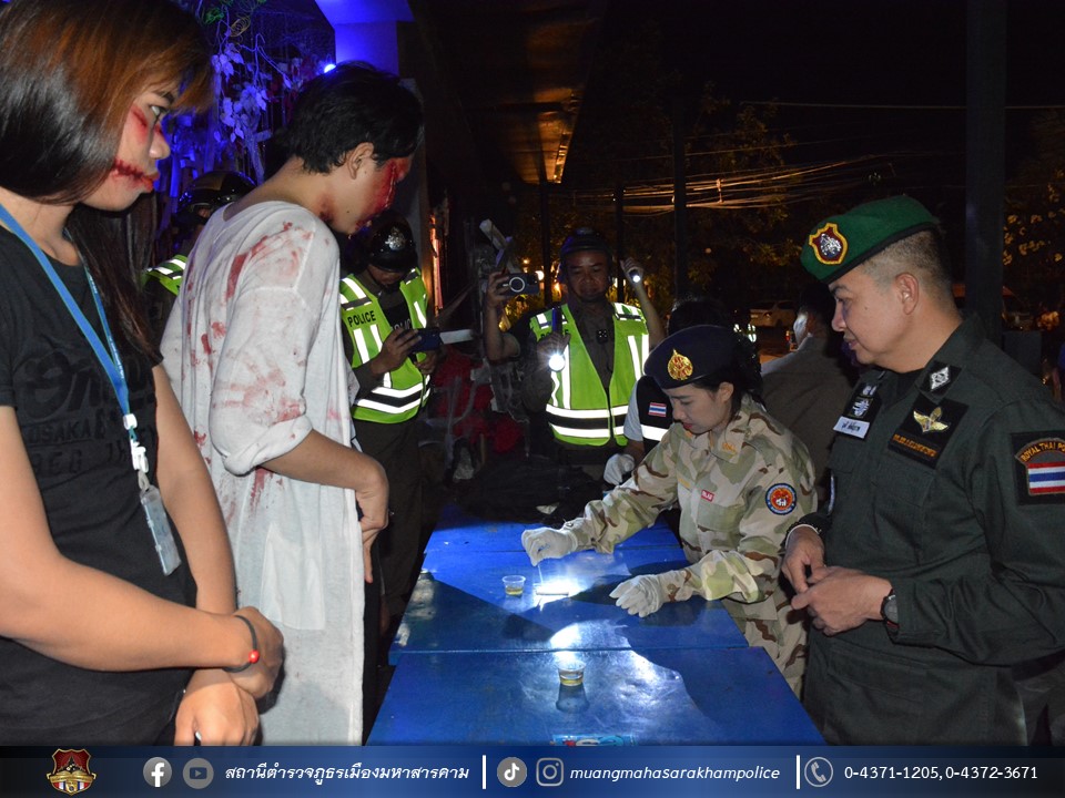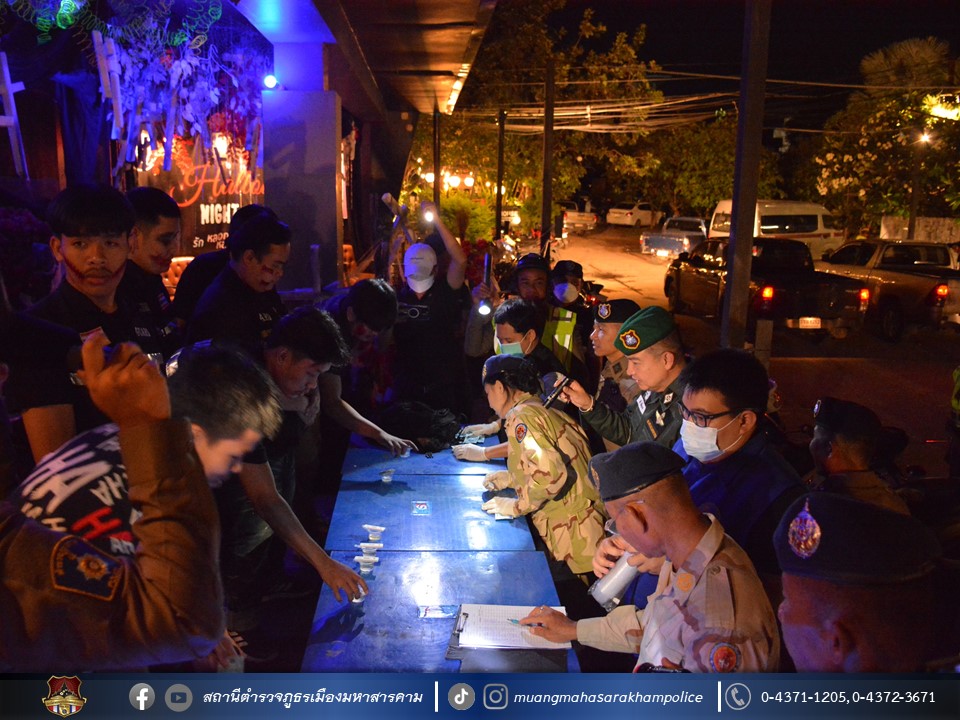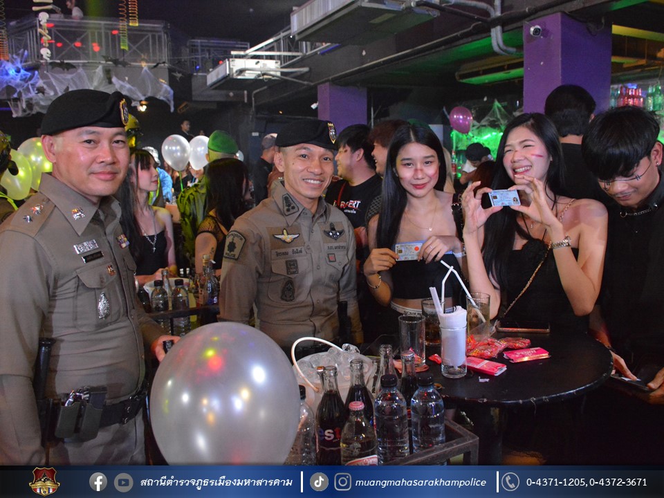 พร้อมด้วยเจ้าหน้าที่ฝ่ายปกครองอำเภอเมืองมหาสารคาม เจ้าหน้าที่สาธารณสุขอำเภอเมืองมหาสารคาม ข้าราชการตำรวจ กก.สส.ภ.จว.มหาสารคาม ข้าราชการตำรวจ สตม.จว.มหาสารคาม ข้าราชการตำรวจท่องเที่ยว กก.1 บก.ทท.2 และข้าราชการตำรวจ สภ.เมืองมหาสารคาม ร่วมพิธีปล่อยแถวชุดจัดระเบียบสังคม และตรวจสถานบริการเนื่องในวันฮาโลวีน มีลำดับการตรวจสถานบริการดังต่อไปนี้
