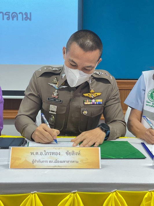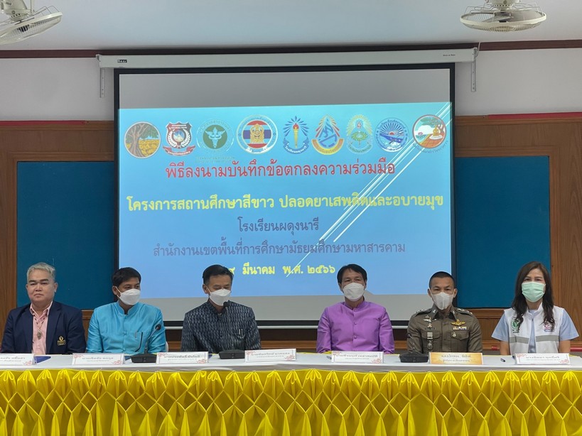 วันนี้( 9 มี.ค.66 เวลา 09.00 น. พ.ต.อ.ไกรทอง ชัยสิงห์ ผกก.เมืองมหาสารคาม ร่วมพิธีลงนามบันทึกข้อตกลงความร่วมมือ โครงการสถานศึกษาสีขาว ปลอดยาเสพติดและอบายมุข โรงเรียนผดุงนารี สำนักงานเขตพื้นที่การศึกษามันธยมศึกษามหาสารคาม ณ โรงเรียนผดุงนารี ต.ตลาด อ.เมืองมหาสารคาม จ.มหาสารคาม