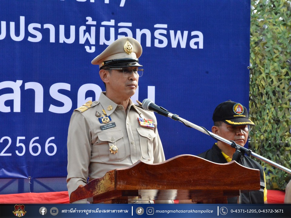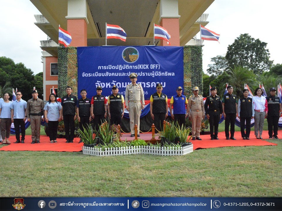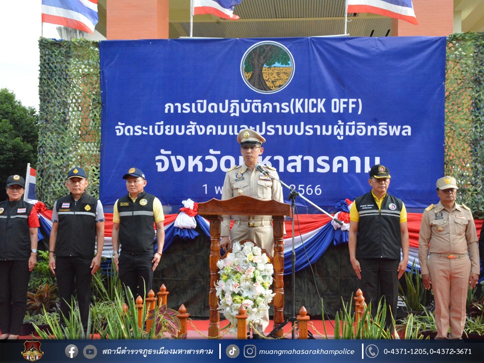 ร่วมพิธีปล่อยแถวระดมกวาดล้างสิ่งผิดกฎหมาย ตามนโยบายการจัดระเบียบสังคมและปราบปรามผู้มีอิทธิพล โดยบูรณาการความร่วมมือส่วนราชการที่เกี่ยวข้อง เพื่อสนองนโยบายของรัฐบาลและรัฐมนตรีว่าการกระทรวงมหาดไทย ในการป้องกันและปราบปรามผู้มีอิทธิพลในพื้นที่ พร้อมทั้งออกตรวจจัดระเบียบสังคม เพื่อกวดขัน ตรวจตรา และให้คำแนะนำต่อสถานบริการสถานประกอบกิจการต่าง ๆ ได้ถือปฏิบัติตามกฎหมายโดยเคร่งครัด ให้ปฏิบัติตามมาตรการที่กำหนดในการเปิดให้บริการ เน้นย้ำห้ามเด็กและเยาวชนเข้าใช้บริการ ในสถานบริการและห้ามจำหน่ายเครื่องดื่มแอลกอฮอล์ให้เด็กและเยาวชน รวมถึงการปิดให้บริการตามเวลาที่กฎหมายกำหนด อันเป็นการสร้างความเชื่อมั่นให้แก่ประชาชนในพื้นที่ โดยมีนายวิบูรณ์ แววบัณฑิต ผู้ว่าราชการจังหวัดมหาสารคาม เป็นประธานในพิธี