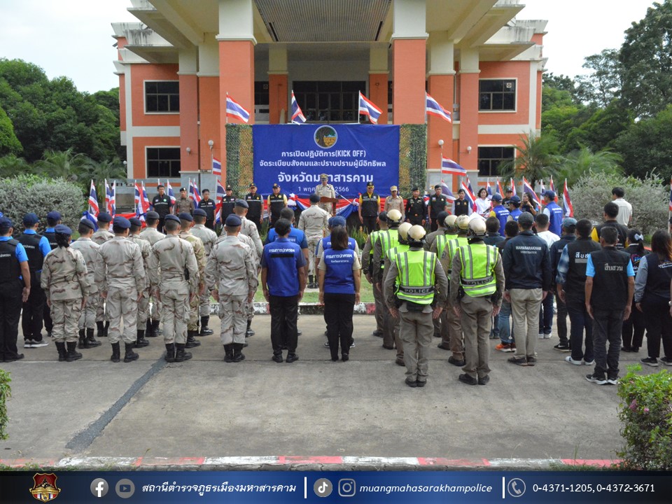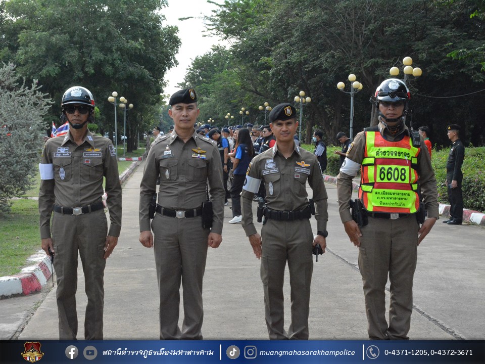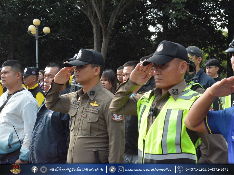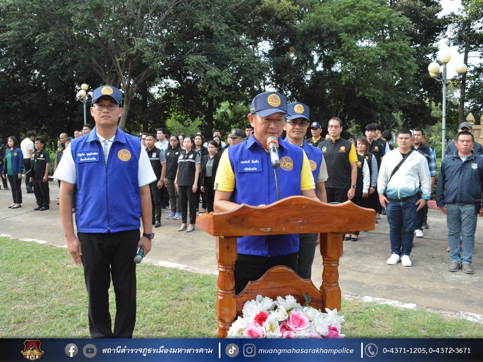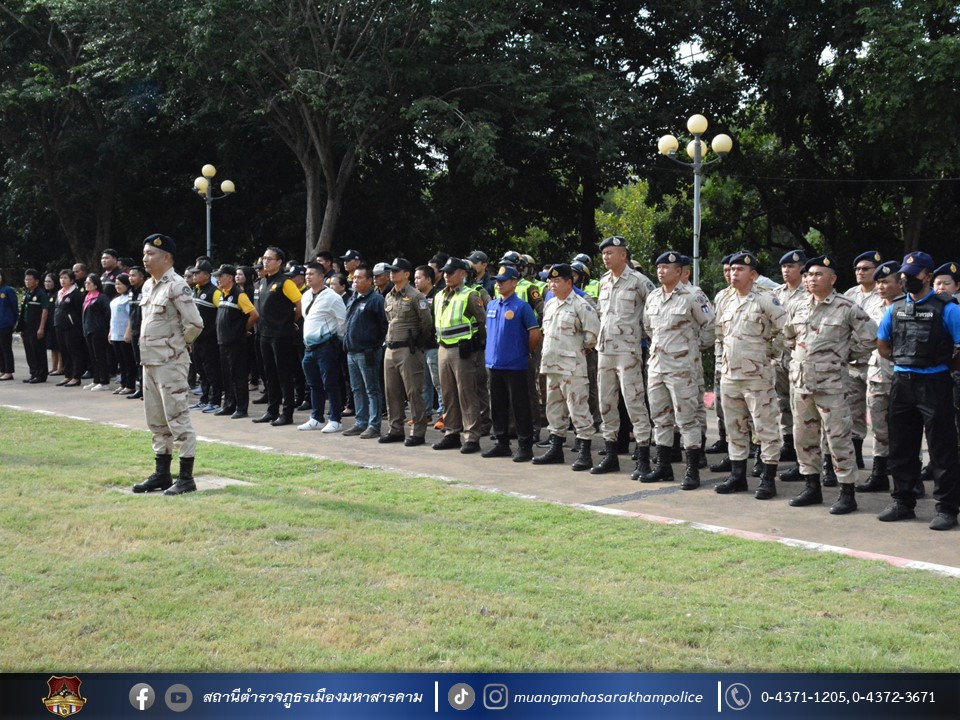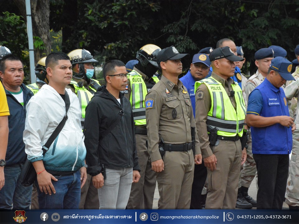 วันที่ 1 พฤศจิกายน 2566 เวลา 15.00 น. พ.ต.อ.ไกรทอง ชัยสิงห์ ผกก.สภ.เมืองมหาสารคาม, พ.ต.ท.เทอดศักดิ์ พีระพันธุ์ รอง ผกก.จร.สภ.เมืองมหาสารคาม, พ.ต.ท.กฤษฎา นิติพจน์ รอง ผกก.สส.สภ.เมืองมหาสารคาม, พ.ต.ท.กิตภากร ภูคำสอน สวป.สภ.เมืองมหาสารคาม, พ.ต.ท.ชัยยุทธ รอดเวียง สว.จร.สภ.เมืองมหาสารคาม, พ.ต.ท.สุวันชัย สีทา สว.สส.สภ.เมืองมหาสารคาม พร้อมด้วยหัวหน้าส่วนราชการ/ผู้แทนส่วนราชการจังหวัดมหาสารคาม, พนักงาน – เจ้าหน้าที่ในสังกัดจังหวัดมหาสารคาม และข้าราชการตำรวจ สภ.เมืองมหาสารคาม