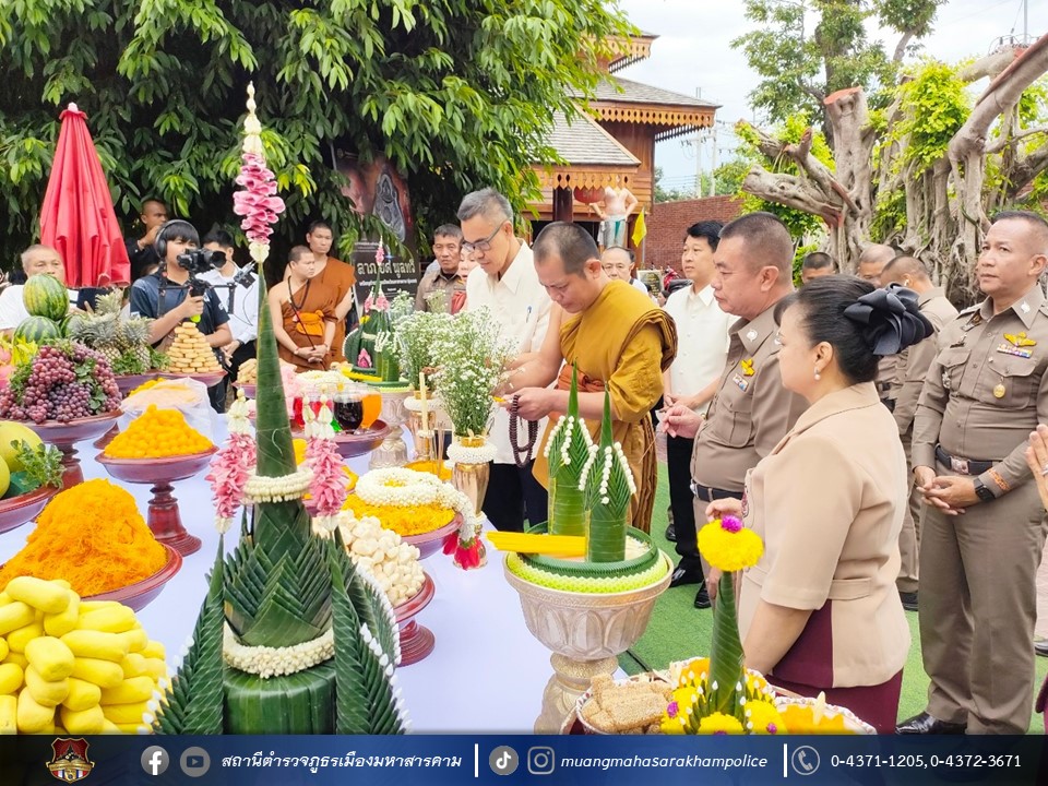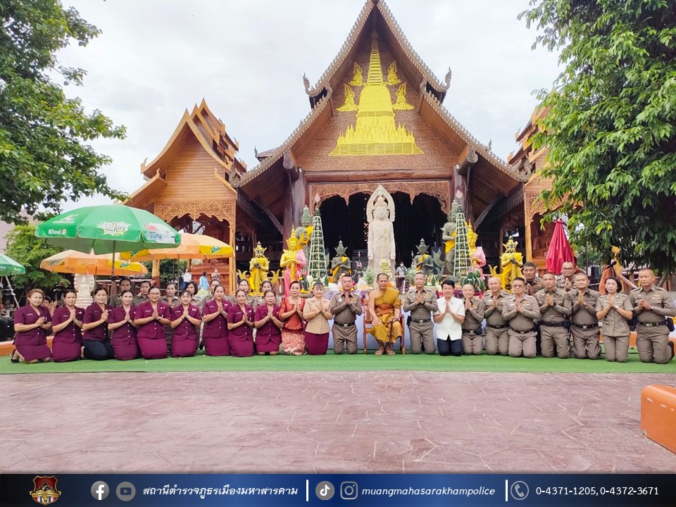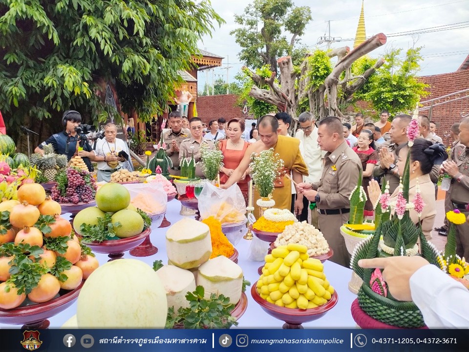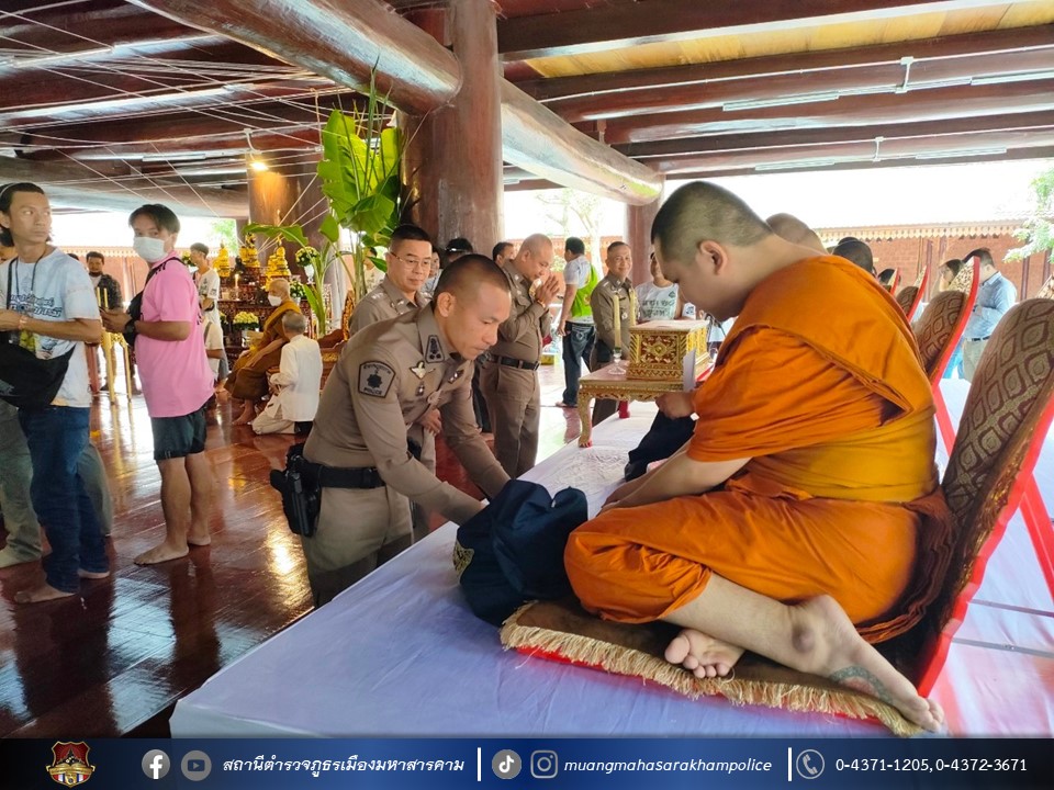 เมื่อวันที่ 27 สิงหาคม 2566 เวลา 08.00 น. ณ มณฑลพิธีใต้อุโบสถไม้ตะเคียนทองวัดพุทธวนาราม(วัดป่าวังน้ำเย็น) อ.เมืองมหาสารคาม จ.มหาสารคาม พล.ต.ต.ดิเรก จิตอร่าม ผบก.ภ.จว.มหาสารคาม, คุณสิริรัช จิตอร่าม ภริยา/ประธานแม่บ้านตำรวจภูธรจังหวัดมหาสารคาม, พ.ต.อ.อุกกฤษฎ์ ทรงชัยสงวน รอง ผบก.ภ.จว.มหาสารคาม, พ.ต.อ.อัครวินต์ สุคนธวิท รอง ผบก.ภ.จว.มหาสารคาม, พ.ต.อ.ไกรทอง ชัยสิงห์ ผกก.สภ.เมืองมหาสารคาม พร้อมด้วย หัวหน้าสถานีตำรวจในสังกัด, ผู้แทนส่วนราชการ, ข้าราชการตำรวจ/คณะแม่บ้านตำรวจจังหวัดมหาสารคาม,ประชาชน