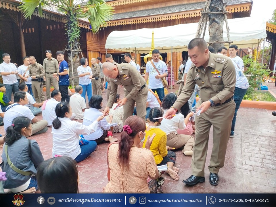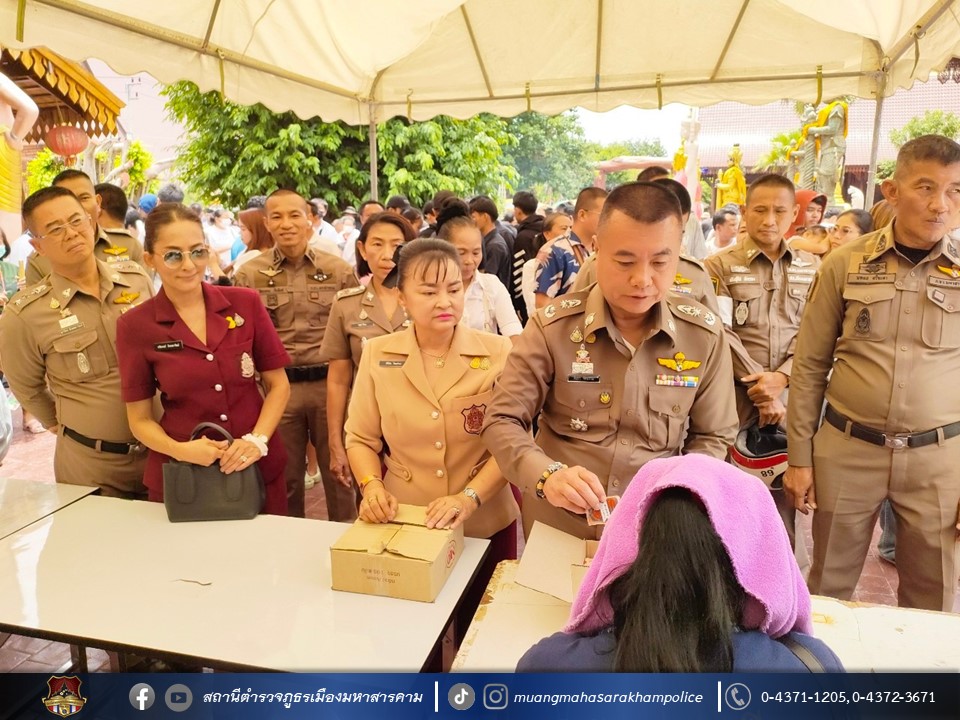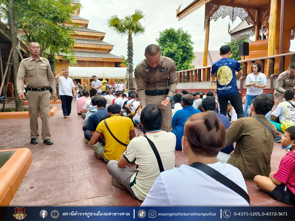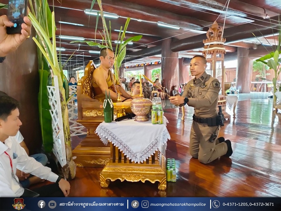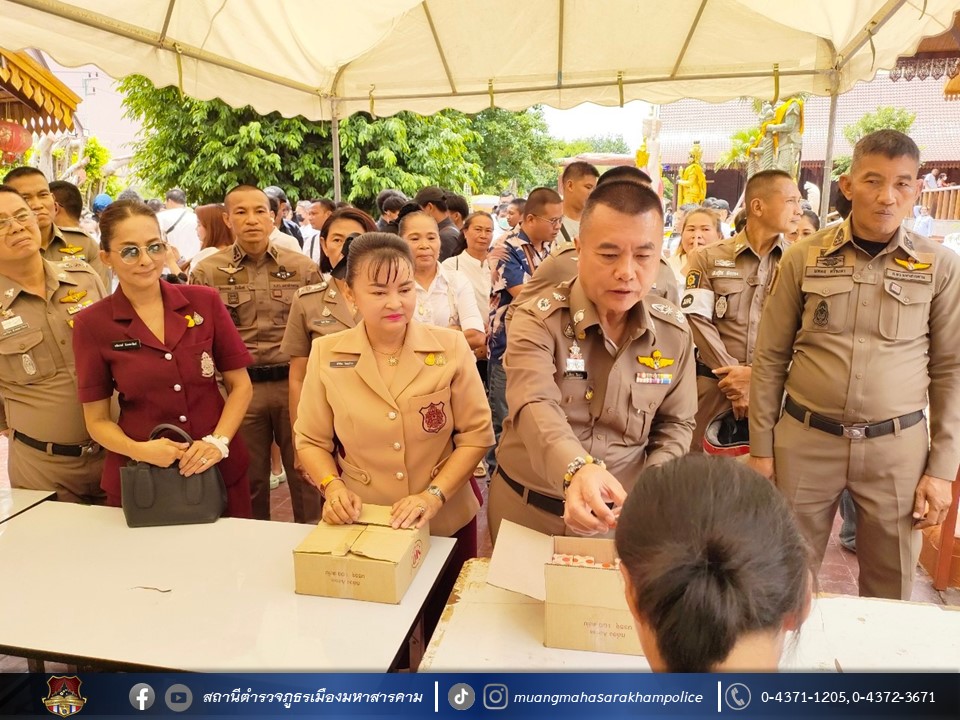 เมื่อวันที่ 27 สิงหาคม 2566 เวลา 08.00 น. ณ มณฑลพิธีใต้อุโบสถไม้ตะเคียนทองวัดพุทธวนาราม(วัดป่าวังน้ำเย็น) อ.เมืองมหาสารคาม จ.มหาสารคาม พล.ต.ต.ดิเรก จิตอร่าม ผบก.ภ.จว.มหาสารคาม, คุณสิริรัช จิตอร่าม ภริยา/ประธานแม่บ้านตำรวจภูธรจังหวัดมหาสารคาม, พ.ต.อ.อุกกฤษฎ์ ทรงชัยสงวน รอง ผบก.ภ.จว.มหาสารคาม, พ.ต.อ.อัครวินต์ สุคนธวิท รอง ผบก.ภ.จว.มหาสารคาม, พ.ต.อ.ไกรทอง ชัยสิงห์ ผกก.สภ.เมืองมหาสารคาม พร้อมด้วย หัวหน้าสถานีตำรวจในสังกัด, ผู้แทนส่วนราชการ, ข้าราชการตำรวจ/คณะแม่บ้านตำรวจจังหวัดมหาสารคาม,ประชาชน