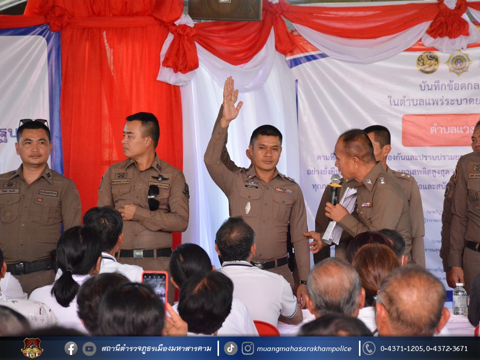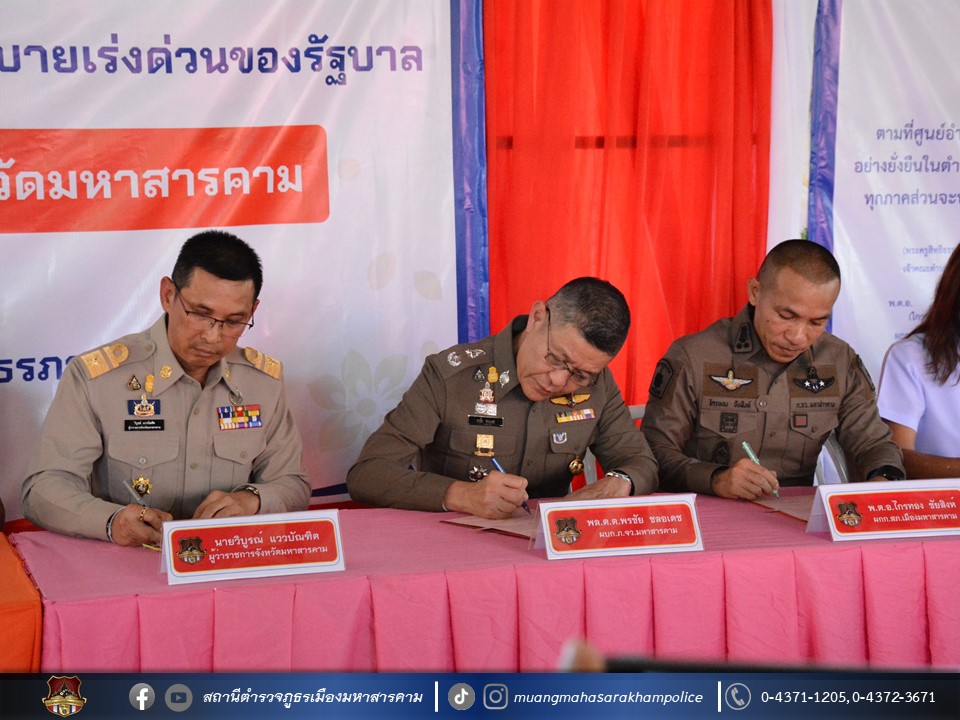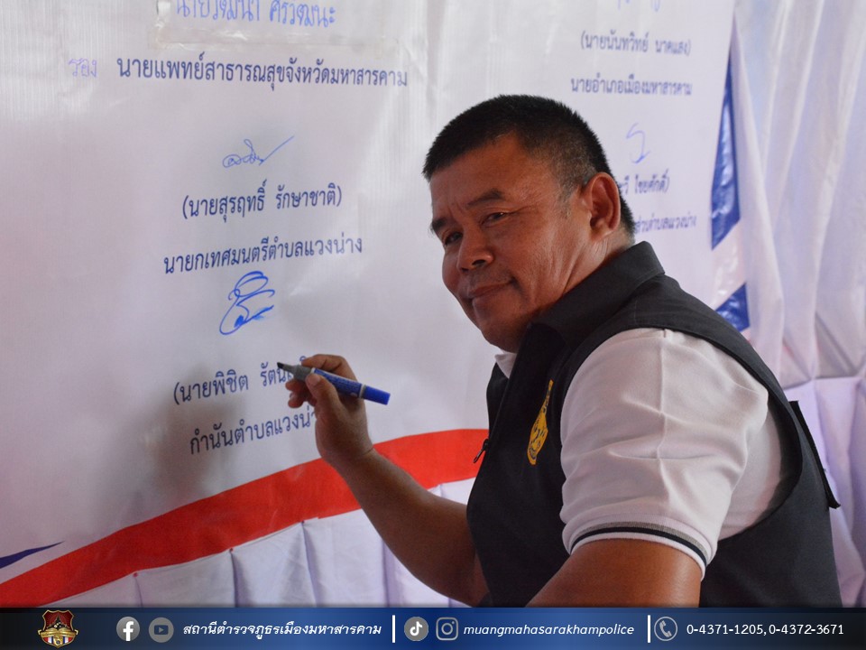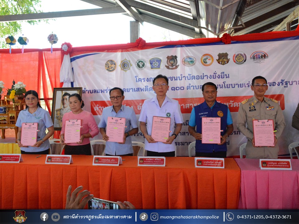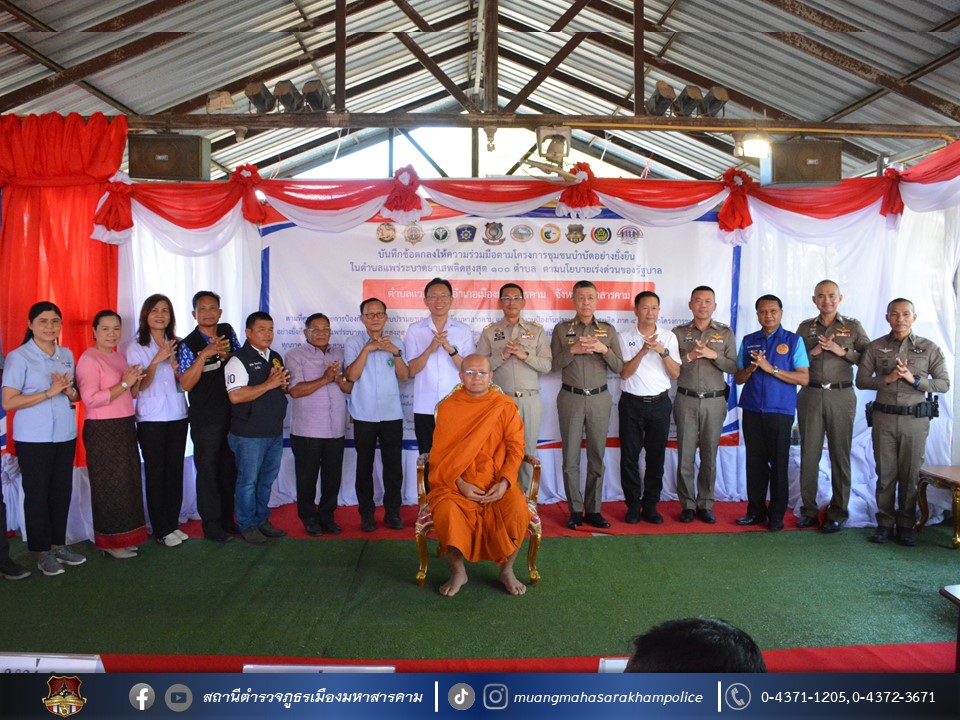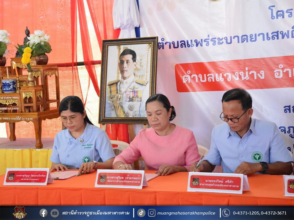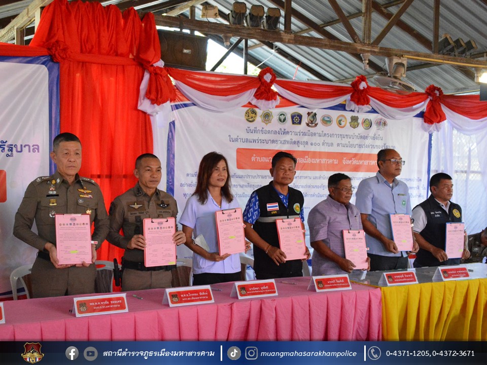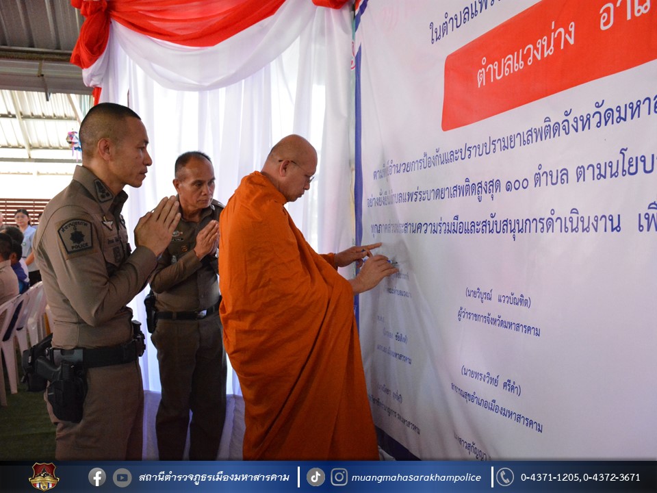 🔸จากนั้น พระครูสิทธิธรรมวาที เจ้าคณะตำบลแวงย่าง, นายวิบูรณ์ แววบัณฑิต ผู้ว่าราชการจังหวัดมหาสารคาม, พล.ต.ต.พรชัย ชลอเดช ผบก.ภ.จว.มหาสารคาม, นายวัฒนา ศรีวัฒนะ รองนายแพทย์สาธารณสุขจังหวัดมหาสารคาม, นายนันทวิทย์ นาคแสง นายอำเภอเมืองมหาสารคาม, พ.ต.อ.ไกรทอง ชัยสิงห์ ผกก.สภ.เมืองมหาสารคาม, นายทรงวิทย์ ศรีคำ สาธารณสุขอำเภอเมืองมหาสารคาม, น.ส.สุวิมล เจ้าแก่นแก้ว พัฒนาการอำเภอเมืองมหาสารคาม, นายสุรฤทธิ์ รักษาชาติ นายกเทศมนตรีตำบลแวงน่าง, นายระวี ไชยศักดิ์ นายกองค์การบริหารส่วนตำบลแวงน่าง, นางนิตยา ฤทธิ์ศรี พยาบาลวิชาชีพชำนาญการ รพ.มหาสารคาม, น.ส.สุกัญญา วัฒนประไพรจิตร ผอ.รพ.สต.แวงน่าง, นายอนันต์ มาตย์พรมราช ผอ.รพ.สต.บ้านโนนเพ็ก, นายพิชิต รัตนเจริญ กำนันตำบลแวงน่าง นายศุภมิตร นาถมทอง รักษาการ ผอ.รร.บ้านหนองแวง ร่วมลงนามบันทึกข้อตกลงให้ความร่วมมือตาม “โครงการชุมชนบำบัดอย่างยั่งยืนในตำบลแพร่ระบาดยาเสพติดสูงสุด 100 ตำบล ตามนโยบายเร่งด่วนของรัฐบาล”ของสถานีตำรวจภูธรเมืองมหาสารคาม พื้นที่ตำบลแวงน่าง อำเภอเมืองมหาสารคาม จังหวัดมหาสารคาม ประจำปี 2567 เพื่อให้ทุกภาคส่วนประสานความร่วมมือและสนับสนุนการดำเนินงานให้เป็นไปอย่างมีประสิทธิภาพ และเกิดประโยชน์สูงสุดแก่ประชาชน