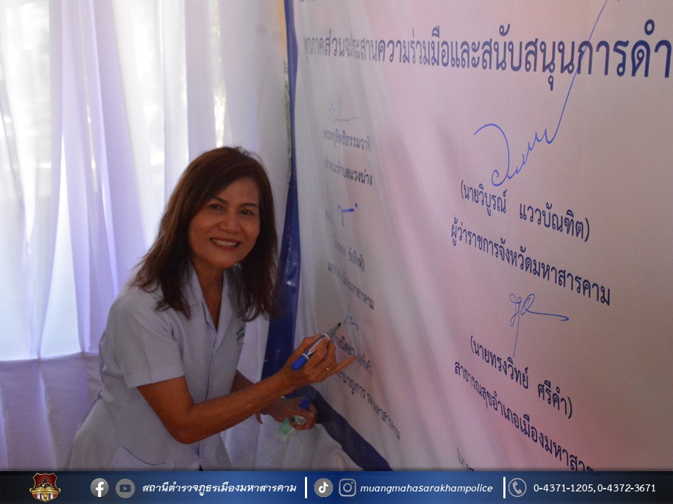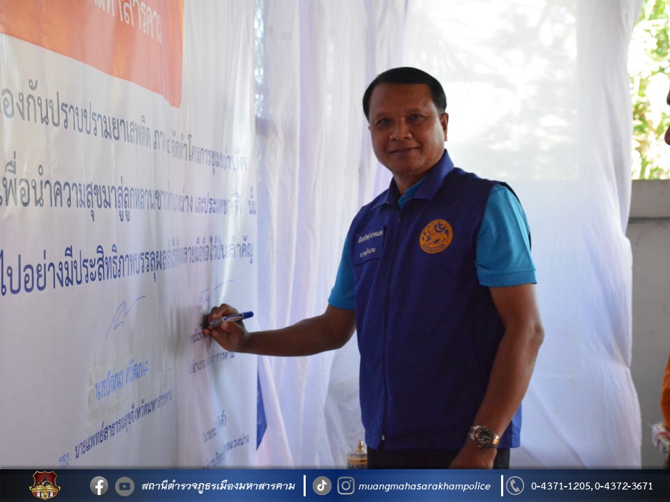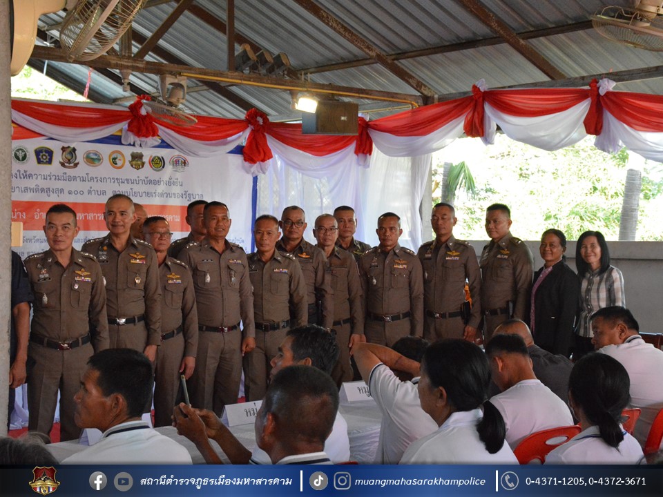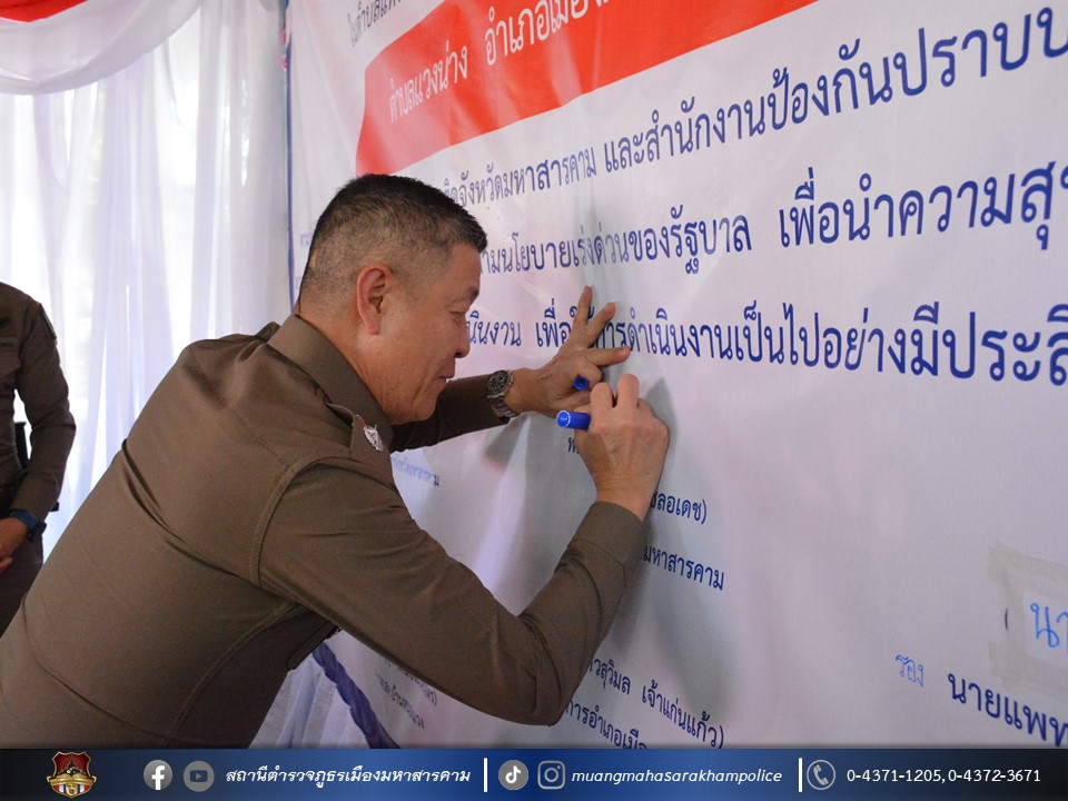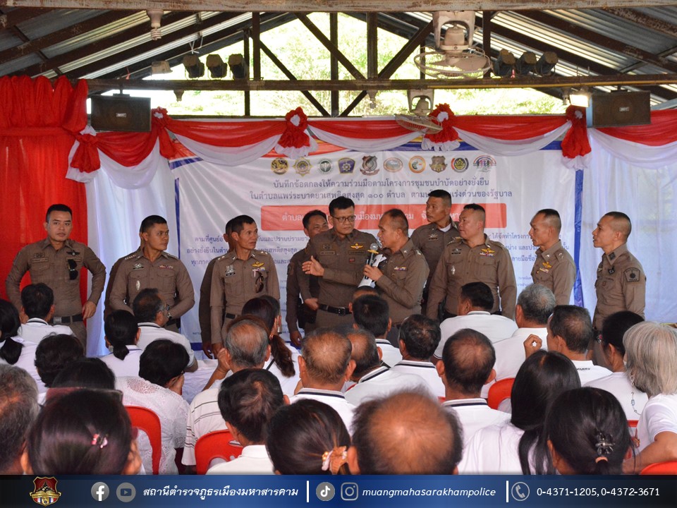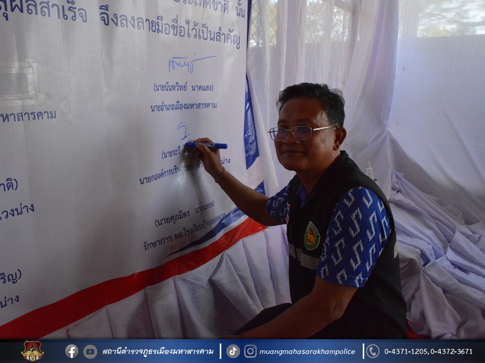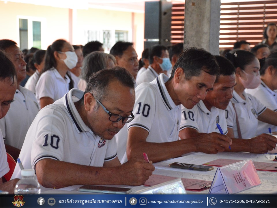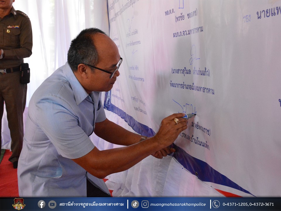 🔸จากนั้น พระครูสิทธิธรรมวาที เจ้าคณะตำบลแวงย่าง, นายวิบูรณ์ แววบัณฑิต ผู้ว่าราชการจังหวัดมหาสารคาม, พล.ต.ต.พรชัย ชลอเดช ผบก.ภ.จว.มหาสารคาม, นายวัฒนา ศรีวัฒนะ รองนายแพทย์สาธารณสุขจังหวัดมหาสารคาม, นายนันทวิทย์ นาคแสง นายอำเภอเมืองมหาสารคาม, พ.ต.อ.ไกรทอง ชัยสิงห์ ผกก.สภ.เมืองมหาสารคาม, นายทรงวิทย์ ศรีคำ สาธารณสุขอำเภอเมืองมหาสารคาม, น.ส.สุวิมล เจ้าแก่นแก้ว พัฒนาการอำเภอเมืองมหาสารคาม, นายสุรฤทธิ์ รักษาชาติ นายกเทศมนตรีตำบลแวงน่าง, นายระวี ไชยศักดิ์ นายกองค์การบริหารส่วนตำบลแวงน่าง, นางนิตยา ฤทธิ์ศรี พยาบาลวิชาชีพชำนาญการ รพ.มหาสารคาม, น.ส.สุกัญญา วัฒนประไพรจิตร ผอ.รพ.สต.แวงน่าง, นายอนันต์ มาตย์พรมราช ผอ.รพ.สต.บ้านโนนเพ็ก, นายพิชิต รัตนเจริญ กำนันตำบลแวงน่าง นายศุภมิตร นาถมทอง รักษาการ ผอ.รร.บ้านหนองแวง ร่วมลงนามบันทึกข้อตกลงให้ความร่วมมือตาม “โครงการชุมชนบำบัดอย่างยั่งยืนในตำบลแพร่ระบาดยาเสพติดสูงสุด 100 ตำบล ตามนโยบายเร่งด่วนของรัฐบาล”ของสถานีตำรวจภูธรเมืองมหาสารคาม พื้นที่ตำบลแวงน่าง อำเภอเมืองมหาสารคาม จังหวัดมหาสารคาม ประจำปี 2567 เพื่อให้ทุกภาคส่วนประสานความร่วมมือและสนับสนุนการดำเนินงานให้เป็นไปอย่างมีประสิทธิภาพ และเกิดประโยชน์สูงสุดแก่ประชาชน