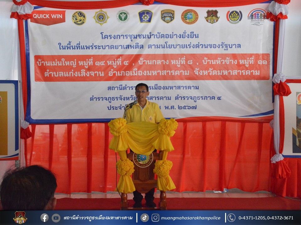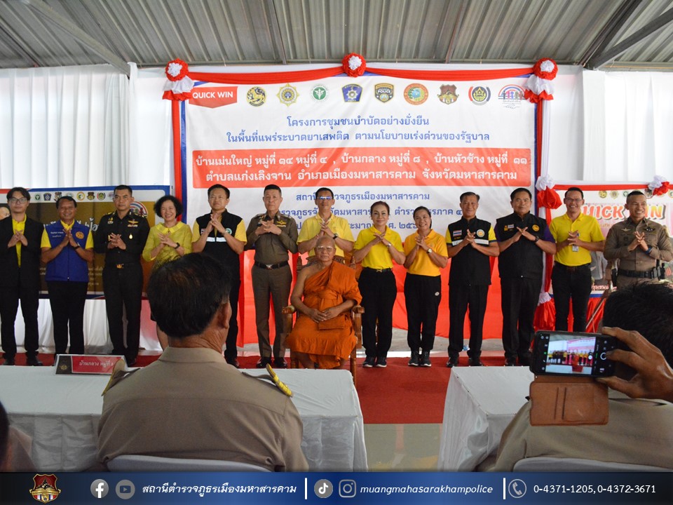 🔹นายวิบูรณ์ แววบัณฑิต ผู้ว่าราชการจังหวัดมหาสารคาม เป็นประธานในพิธีเปิด “โครงการชุมชนบำบัดอย่างยั่งยืน ในพื้นที่แพร่ระบาดยาเสพติด ตามนโยบายรัฐบาล บ้านเม่นใหญ่ หมู่ที่ 4, หมู่ที่ 14, บ้านกลาง หมู่ที่ 8, บ้านหัวช้าง หมู่ที่ 11 ตำบลแก่งเลิงจาน อำเภอเมืองมหาสารคาม จังหวัดมหาสารคาม สถานีตำรวจภูธรเมืองมหาสารคาม” โดยมี