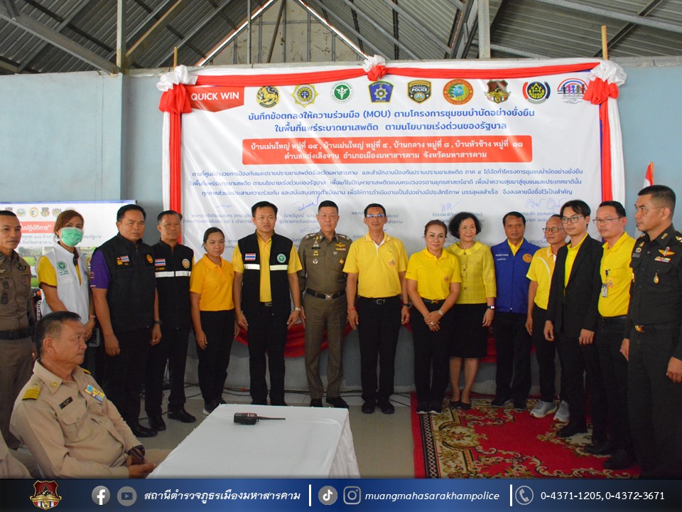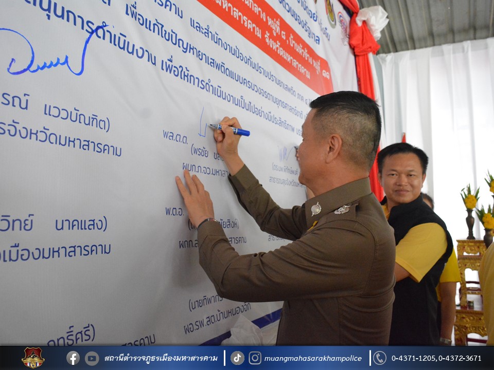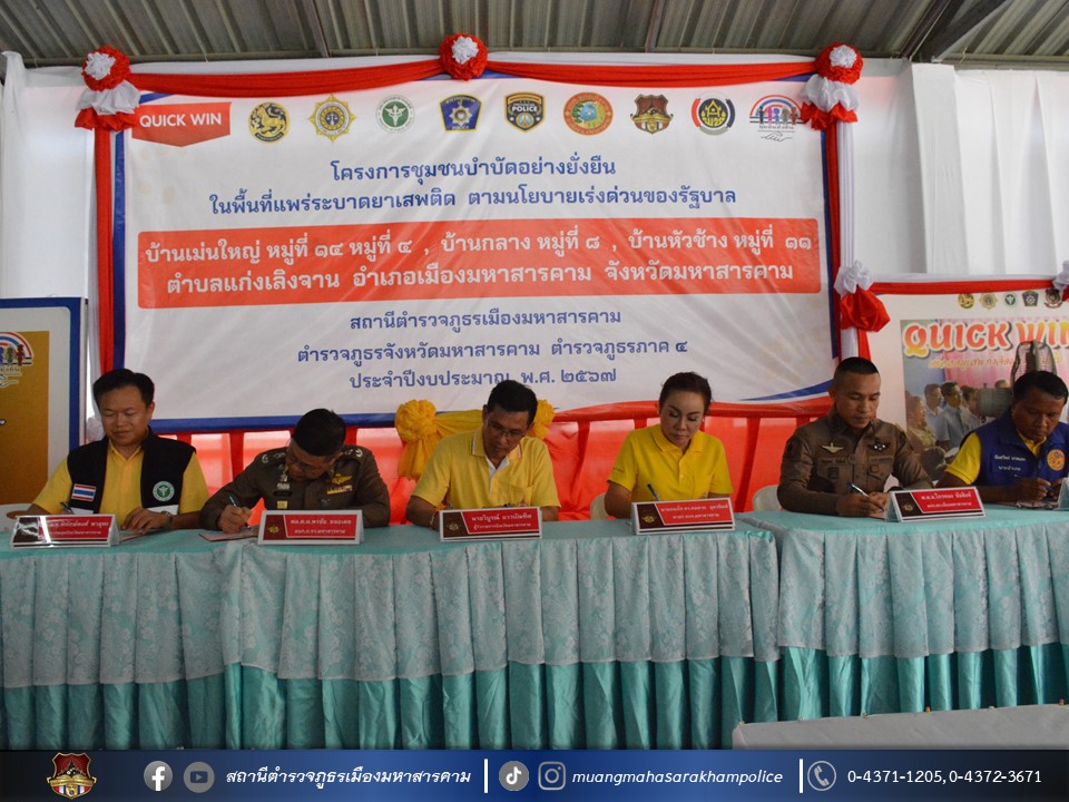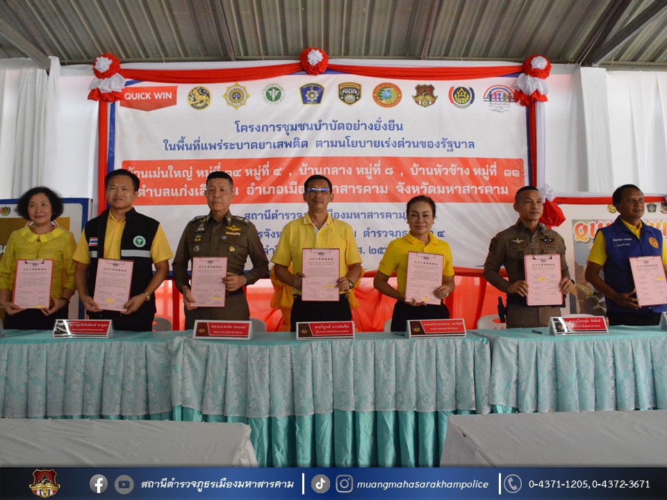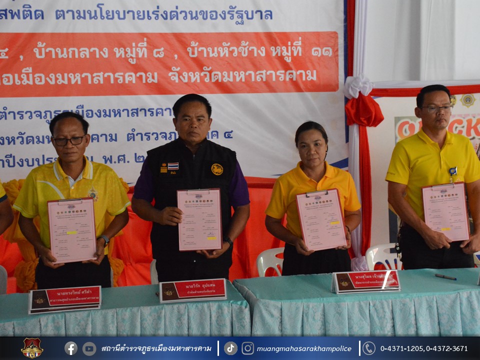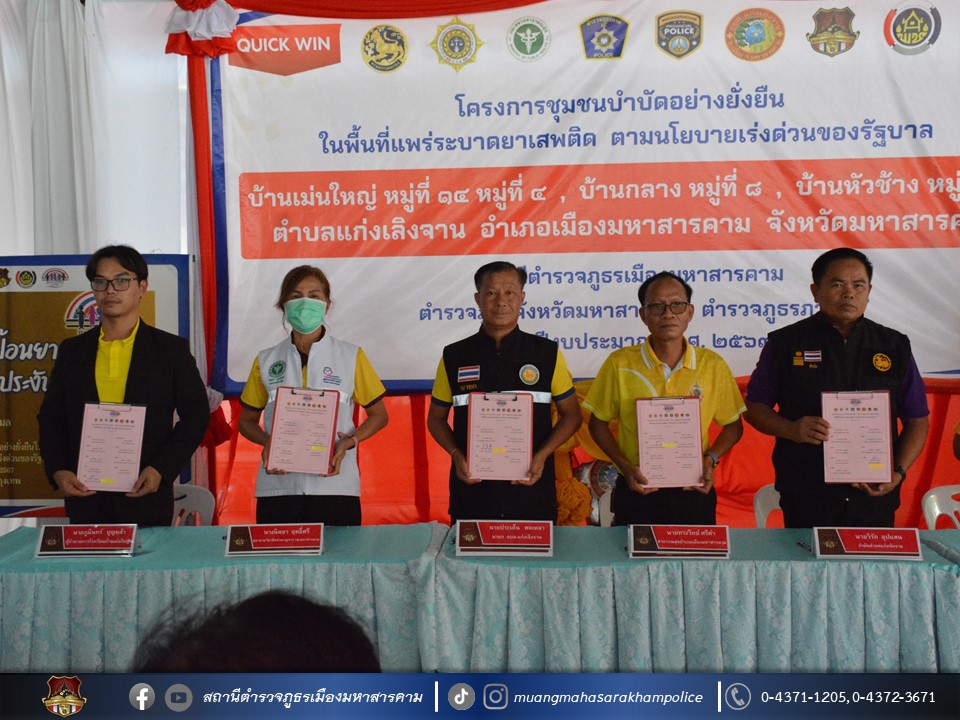 🔸จากนั้น พระครูประโชติธรรมสุนทร(คานชุตินุธโร) เจ้าคณะตำบลแก่งเลิงจาน เขต 1, นายวิบูรณ์ แววบัณฑิต ผู้ว่าราชการจังหวัดมหาสารคาม, พล.ต.ต.พรชัย ชลอเดช ผบก.ภ.จว.มหาสารคาม, ดร.นพ.พิทักษ์พงศ์ พายุหะ นายแพทย์สาธารณสุขจังหวัดมหาสารคาม, นายกองโท ดร.คมคาย อุดรทิพย์ นายก อบจ.มหาสารคาม, พ.อ.สุธนณ์ เต็มตำนาน รอง ผอ.กอ.รมน.จังหวัดมหาสารคาม, นายนันทวิทย์ นาคแสง นายอำเภอเมืองมหาสารคาม, นายทรงวิทย์ ศรีคำ สาธารณสุขอำเภอเมืองมหาสารคาม, น.ส.สุวิมล เจ้าแก่นแก้ว พัฒนาการอำเภอเมืองมหาสารคาม, พ.ต.อ.ไกรทอง ชัยสิงห์ ผกก.สภ.เมืองมหาสารคาม, นายประเด็น พลเหลา นายก อบต.แก่งเลิงจาน, นายทิพากร ดีแดง ผอ.รพ.สต.บ้านหนองจิก, นายภูมินทร์ บุญหล้า ผอ.รร.บ้านเม่นใหญ่ร่วมลงนามบันทึกข้อตกลงให้ความร่วมมือตาม “โครงการชุมชนบำบัดอย่างยั่งยืน ในพื้นที่แพร่ระบาดยาเสพติด ตามนโยบายรัฐบาล บ้านเม่นใหญ่ หมู่ที่ 4, หมู่ที่ 14, บ้านกลาง หมู่ที่ 8, บ้านหัวช้าง หมู่ที่ 11 ตำบลแก่งเลิงจาน อำเภอเมืองมหาสารคาม จังหวัดมหาสารคาม สถานีตำรวจภูธรเมืองมหาสารคาม” เพื่อให้ทุกภาคส่วนประสานความร่วมมือและสนับสนุนการดำเนินงานให้เป็นไปอย่างมีประสิทธิภาพ และเกิดประโยชน์สูงสุดแก่ประชาชน