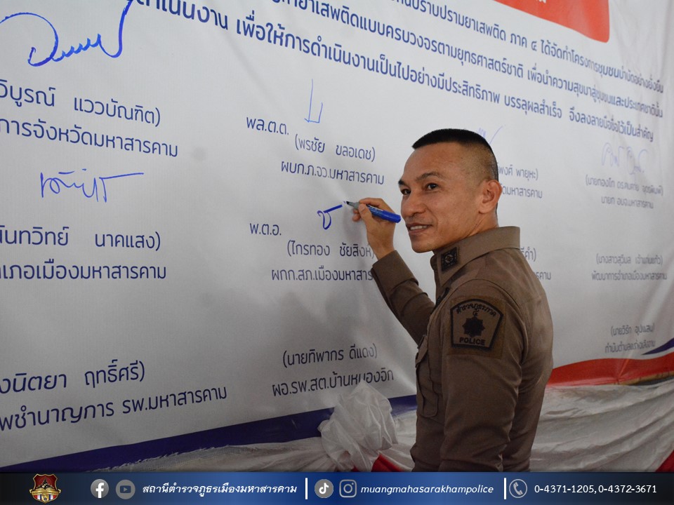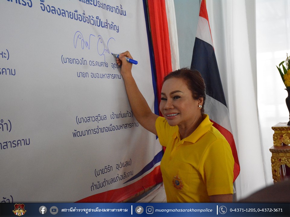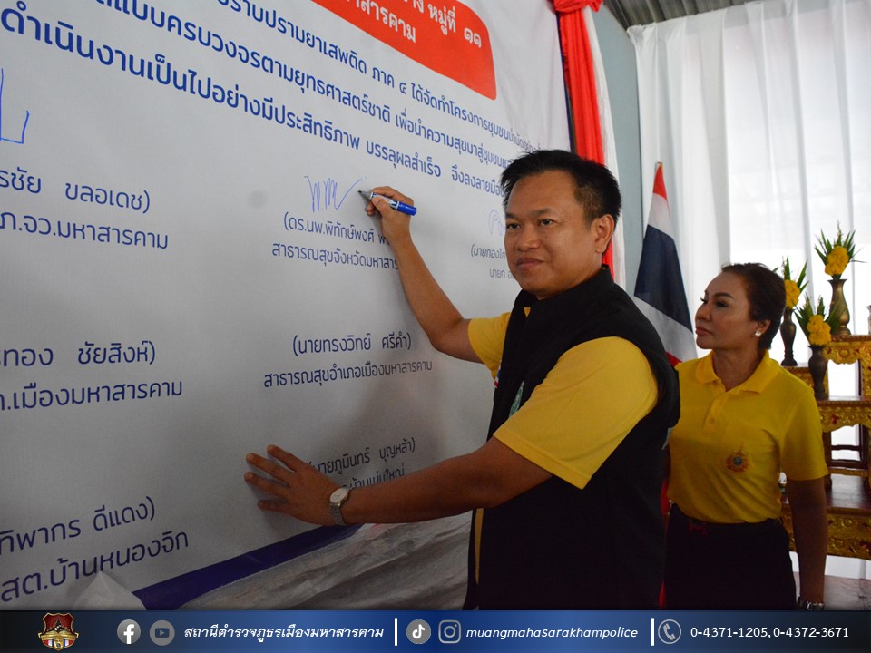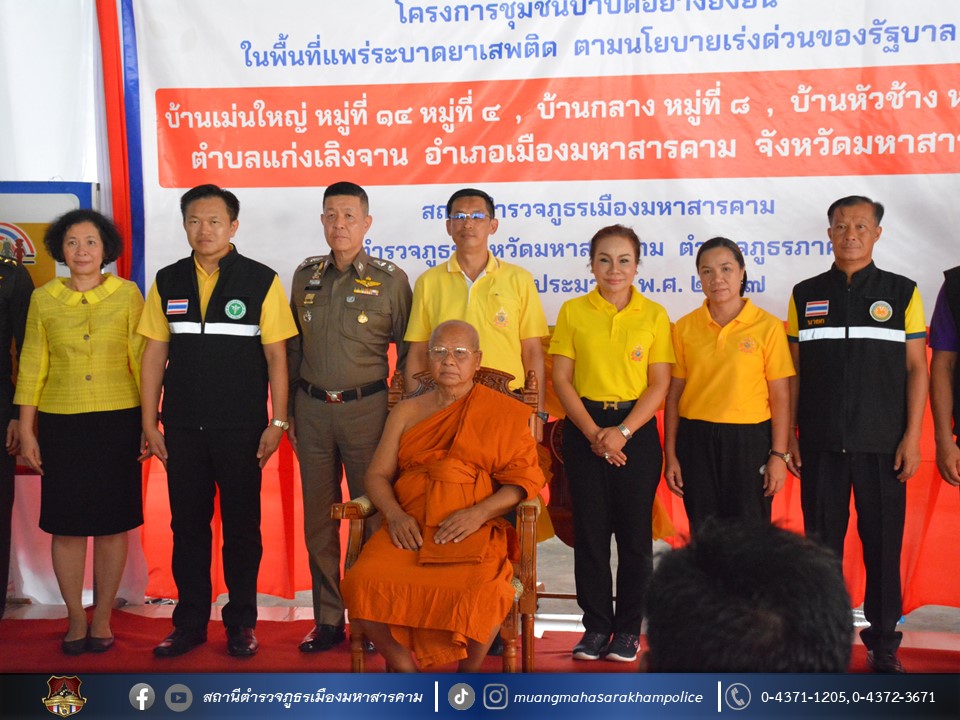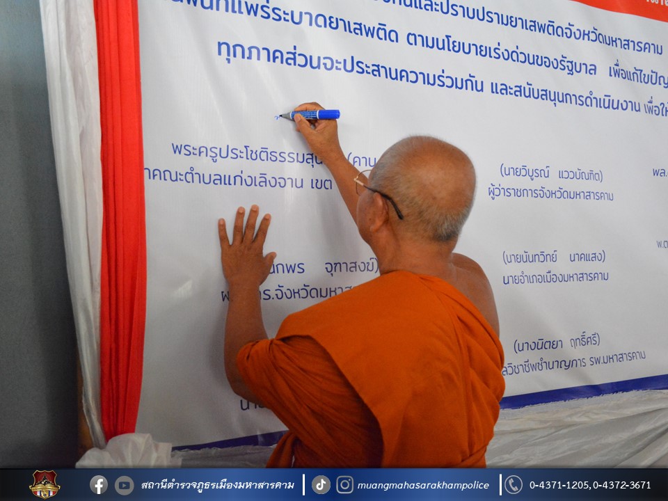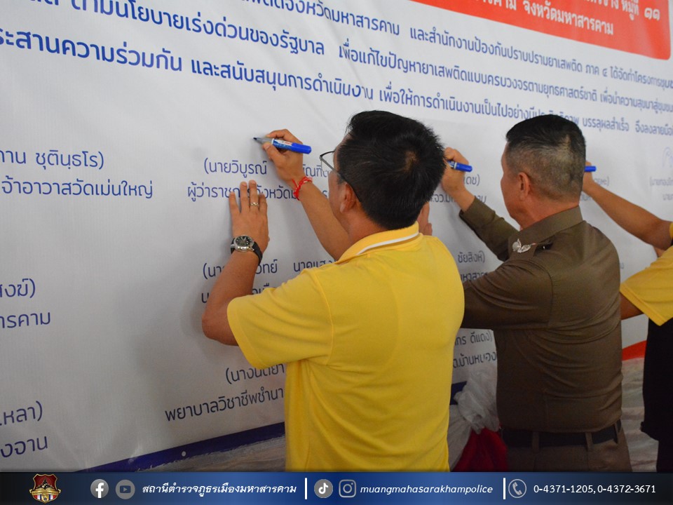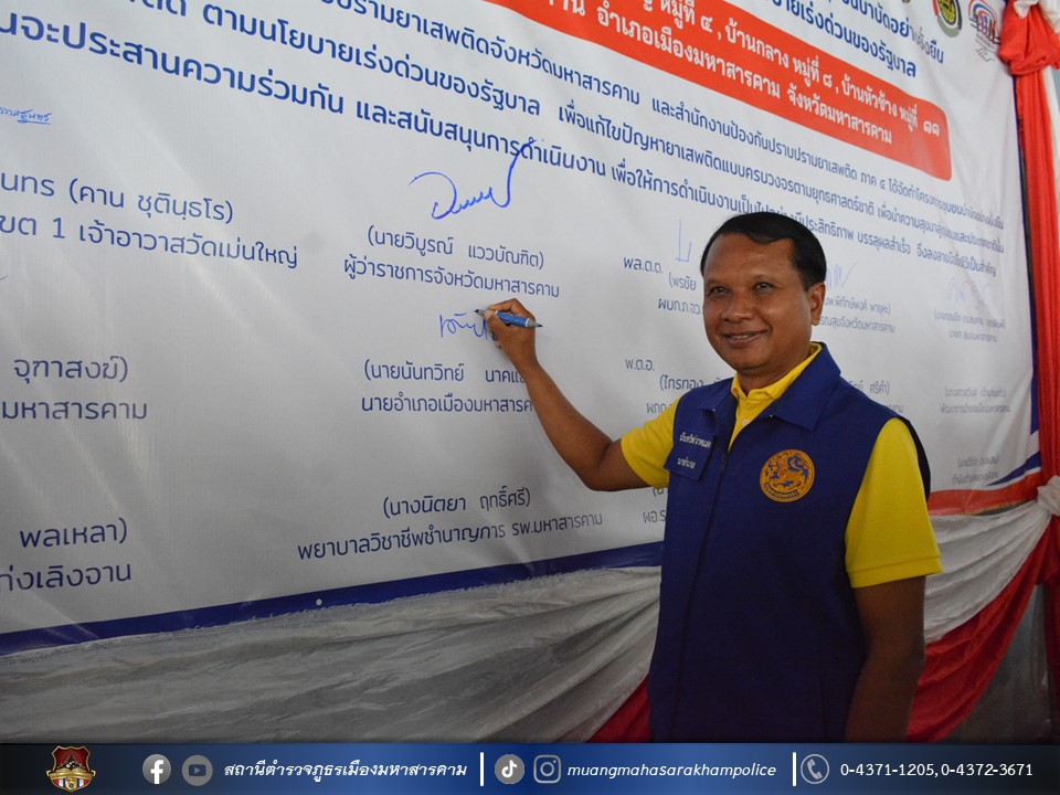 🔸จากนั้น พระครูประโชติธรรมสุนทร(คานชุตินุธโร) เจ้าคณะตำบลแก่งเลิงจาน เขต 1, นายวิบูรณ์ แววบัณฑิต ผู้ว่าราชการจังหวัดมหาสารคาม, พล.ต.ต.พรชัย ชลอเดช ผบก.ภ.จว.มหาสารคาม, ดร.นพ.พิทักษ์พงศ์ พายุหะ นายแพทย์สาธารณสุขจังหวัดมหาสารคาม, นายกองโท ดร.คมคาย อุดรทิพย์ นายก อบจ.มหาสารคาม, พ.อ.สุธนณ์ เต็มตำนาน รอง ผอ.กอ.รมน.จังหวัดมหาสารคาม, นายนันทวิทย์ นาคแสง นายอำเภอเมืองมหาสารคาม, นายทรงวิทย์ ศรีคำ สาธารณสุขอำเภอเมืองมหาสารคาม, น.ส.สุวิมล เจ้าแก่นแก้ว พัฒนาการอำเภอเมืองมหาสารคาม, พ.ต.อ.ไกรทอง ชัยสิงห์ ผกก.สภ.เมืองมหาสารคาม, นายประเด็น พลเหลา นายก อบต.แก่งเลิงจาน, นายทิพากร ดีแดง ผอ.รพ.สต.บ้านหนองจิก, นายภูมินทร์ บุญหล้า ผอ.รร.บ้านเม่นใหญ่ร่วมลงนามบันทึกข้อตกลงให้ความร่วมมือตาม “โครงการชุมชนบำบัดอย่างยั่งยืน ในพื้นที่แพร่ระบาดยาเสพติด ตามนโยบายรัฐบาล บ้านเม่นใหญ่ หมู่ที่ 4, หมู่ที่ 14, บ้านกลาง หมู่ที่ 8, บ้านหัวช้าง หมู่ที่ 11 ตำบลแก่งเลิงจาน อำเภอเมืองมหาสารคาม จังหวัดมหาสารคาม สถานีตำรวจภูธรเมืองมหาสารคาม” เพื่อให้ทุกภาคส่วนประสานความร่วมมือและสนับสนุนการดำเนินงานให้เป็นไปอย่างมีประสิทธิภาพ และเกิดประโยชน์สูงสุดแก่ประชาชน