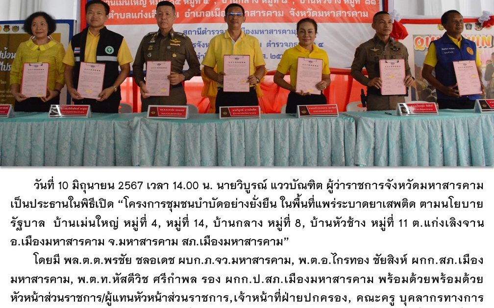 🔸จากนั้น พระครูประโชติธรรมสุนทร(คานชุตินุธโร) เจ้าคณะตำบลแก่งเลิงจาน เขต 1, นายวิบูรณ์ แววบัณฑิต ผู้ว่าราชการจังหวัดมหาสารคาม, พล.ต.ต.พรชัย ชลอเดช ผบก.ภ.จว.มหาสารคาม, ดร.นพ.พิทักษ์พงศ์ พายุหะ นายแพทย์สาธารณสุขจังหวัดมหาสารคาม, นายกองโท ดร.คมคาย อุดรทิพย์ นายก อบจ.มหาสารคาม, พ.อ.สุธนณ์ เต็มตำนาน รอง ผอ.กอ.รมน.จังหวัดมหาสารคาม, นายนันทวิทย์ นาคแสง นายอำเภอเมืองมหาสารคาม, นายทรงวิทย์ ศรีคำ สาธารณสุขอำเภอเมืองมหาสารคาม, น.ส.สุวิมล เจ้าแก่นแก้ว พัฒนาการอำเภอเมืองมหาสารคาม, พ.ต.อ.ไกรทอง ชัยสิงห์ ผกก.สภ.เมืองมหาสารคาม, นายประเด็น พลเหลา นายก อบต.แก่งเลิงจาน, นายทิพากร ดีแดง ผอ.รพ.สต.บ้านหนองจิก, นายภูมินทร์ บุญหล้า ผอ.รร.บ้านเม่นใหญ่ร่วมลงนามบันทึกข้อตกลงให้ความร่วมมือตาม “โครงการชุมชนบำบัดอย่างยั่งยืน ในพื้นที่แพร่ระบาดยาเสพติด ตามนโยบายรัฐบาล บ้านเม่นใหญ่ หมู่ที่ 4, หมู่ที่ 14, บ้านกลาง หมู่ที่ 8, บ้านหัวช้าง หมู่ที่ 11 ตำบลแก่งเลิงจาน อำเภอเมืองมหาสารคาม จังหวัดมหาสารคาม สถานีตำรวจภูธรเมืองมหาสารคาม” เพื่อให้ทุกภาคส่วนประสานความร่วมมือและสนับสนุนการดำเนินงานให้เป็นไปอย่างมีประสิทธิภาพ และเกิดประโยชน์สูงสุดแก่ประชาชน
