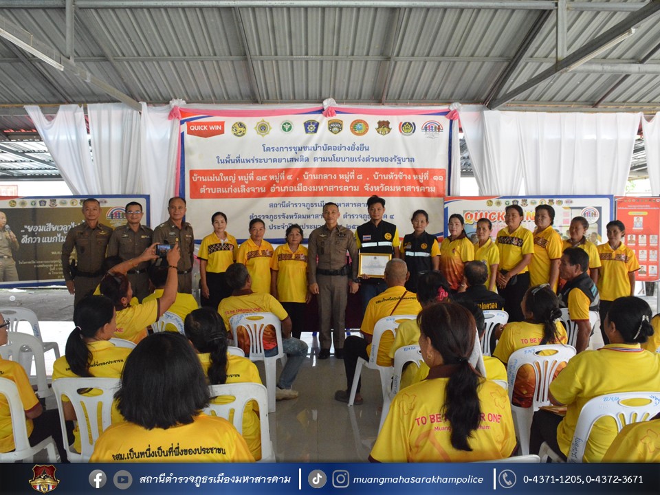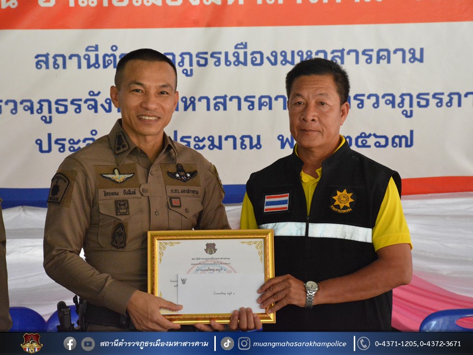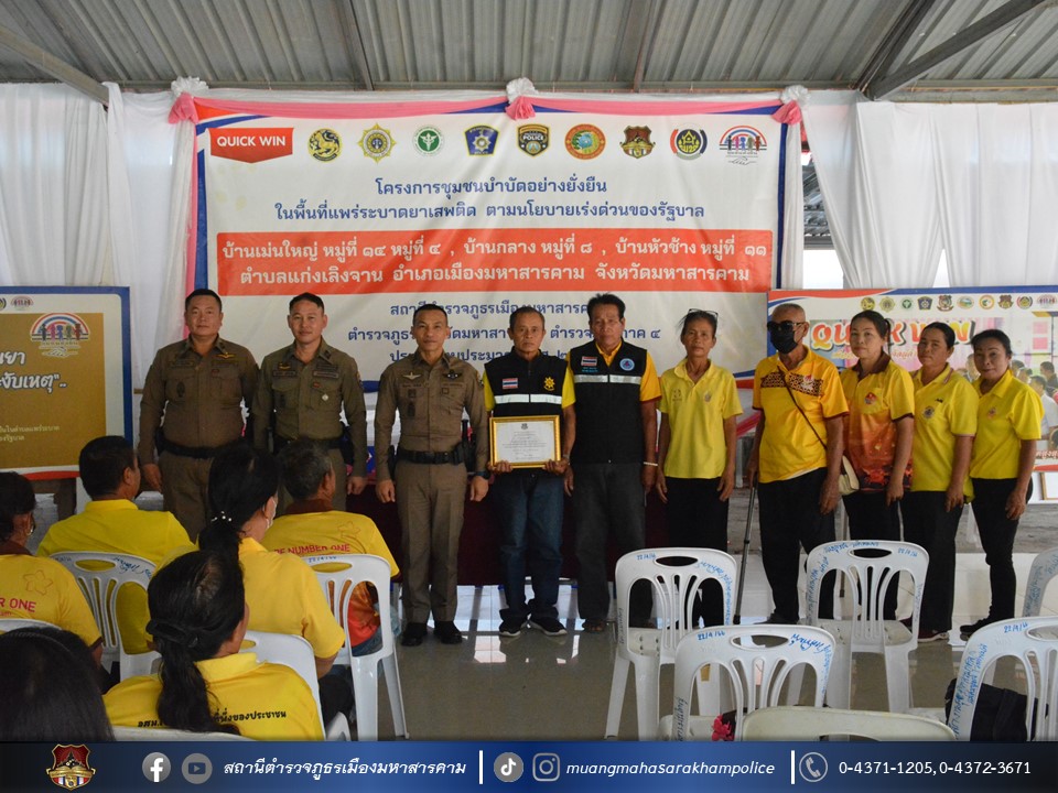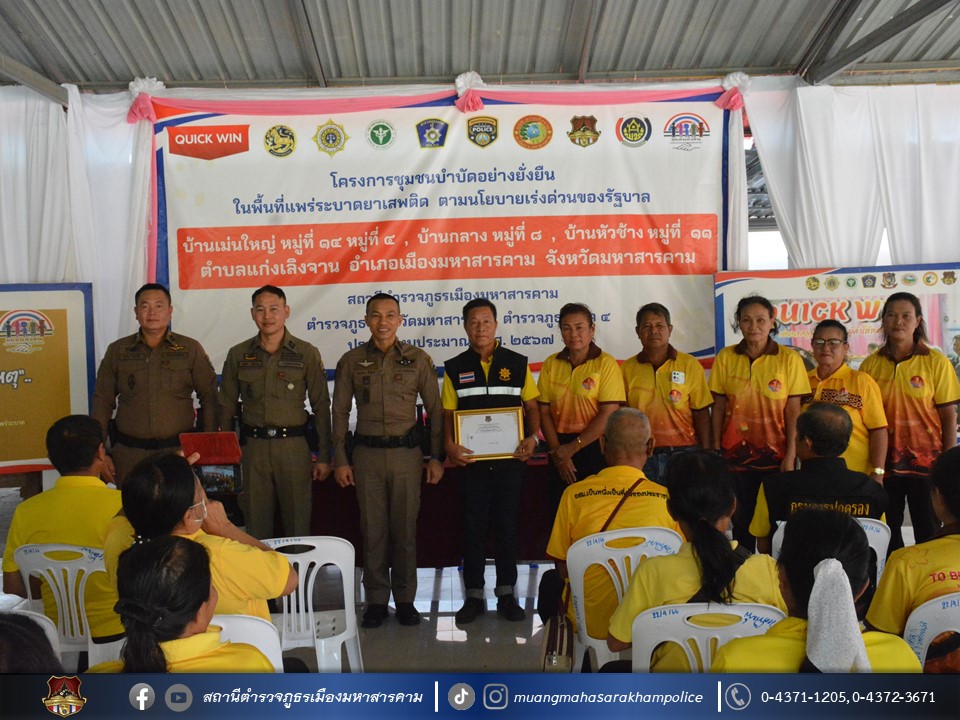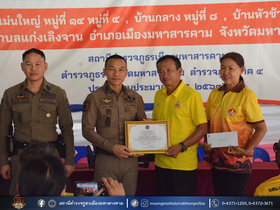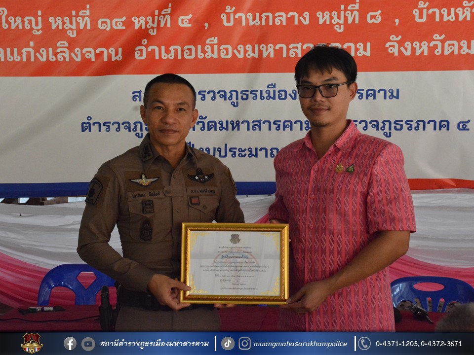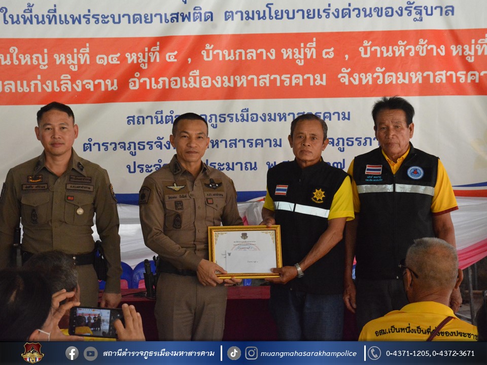 🔸พ.ต.อ.ไกรทอง ชัยสิงห์ ผกก.สภ.เมืองมหาสารคาม ได้มอบใบประกาศเกียรติคุณผู้ให้การสนับสนุนการดูแลผู้ป่วยจากการใช้ยาเสพติด ตามโครงการชุมชนบำบัดอย่างยั่งยืน ในพื้นที่แพร่ระบาดยาเสพติด ตามนโยบายเร่งด่วนของรัฐบาล ประจำปี 2567 บ้านเม่นใหญ่ หมู่ที่ 4,หมู่ที่ 14 บ้านหัวช้าง หมู่ที่ 11 และบ้านกลาง หมู่ที่ 8 ต.แก่งเลิงจาน อ.เมืองมหาสารคาม จ.มหาสารคาม ณ ศูนย์ปฏิบัติการฯ ศาลาประชาคมวัดเม่นใหญ่ ต.แก่งเลิงจาน อ.เมืองหาสารคาม จ.มหาสารคาม