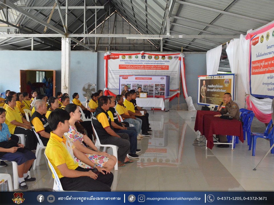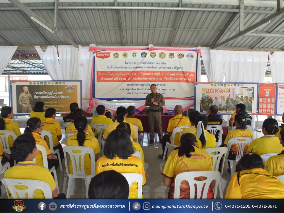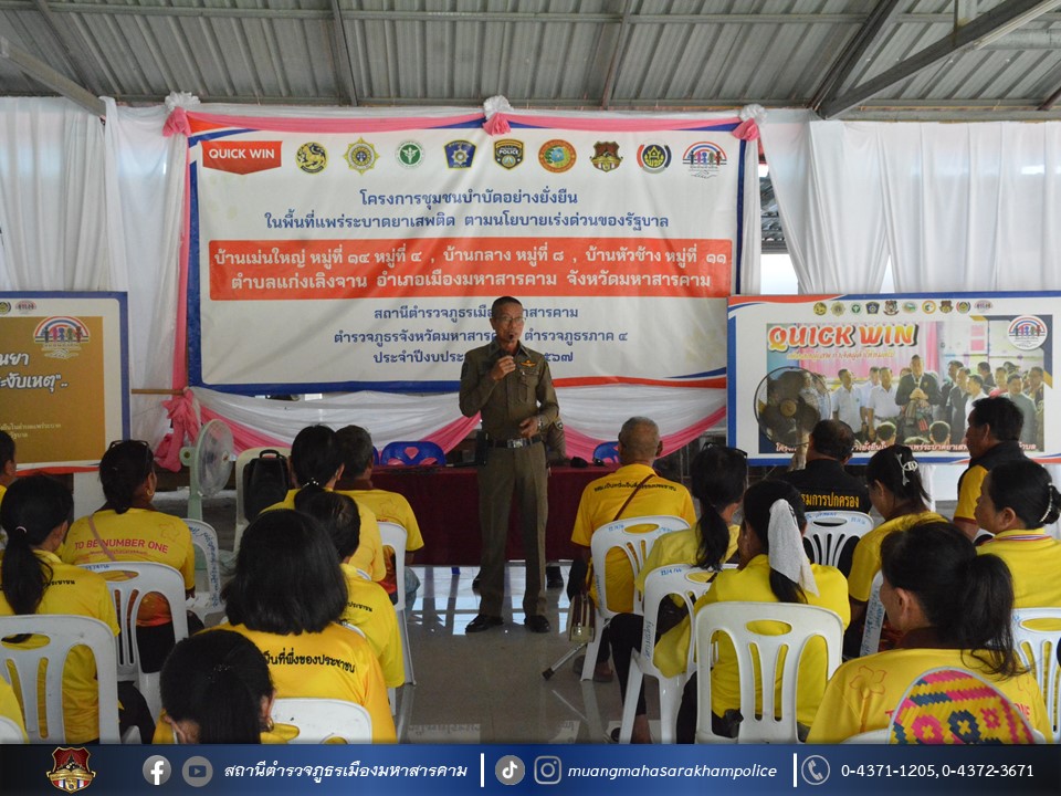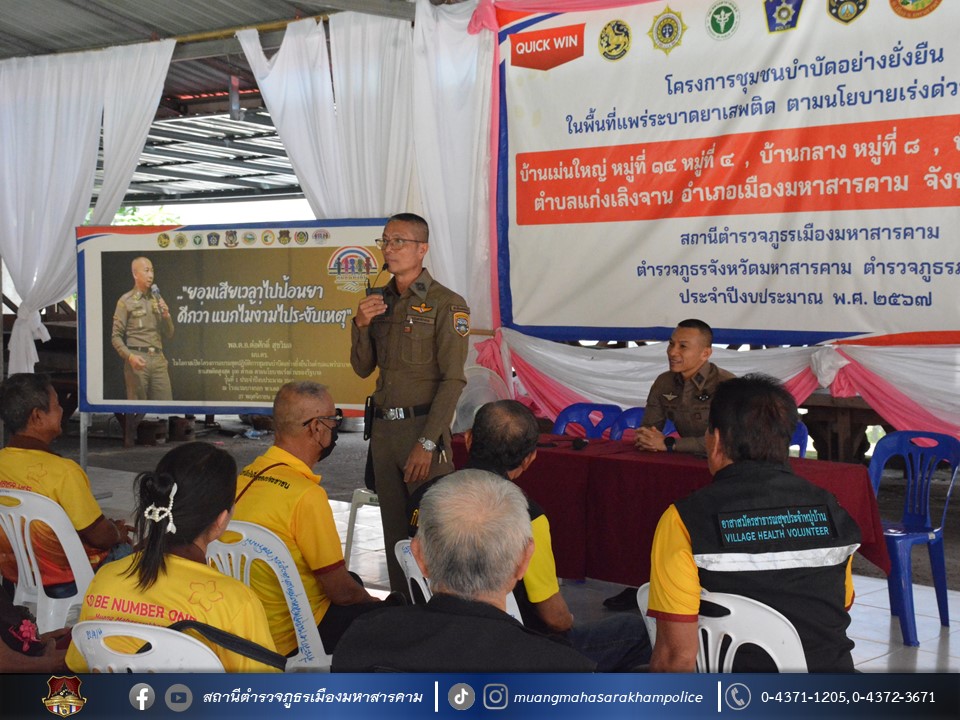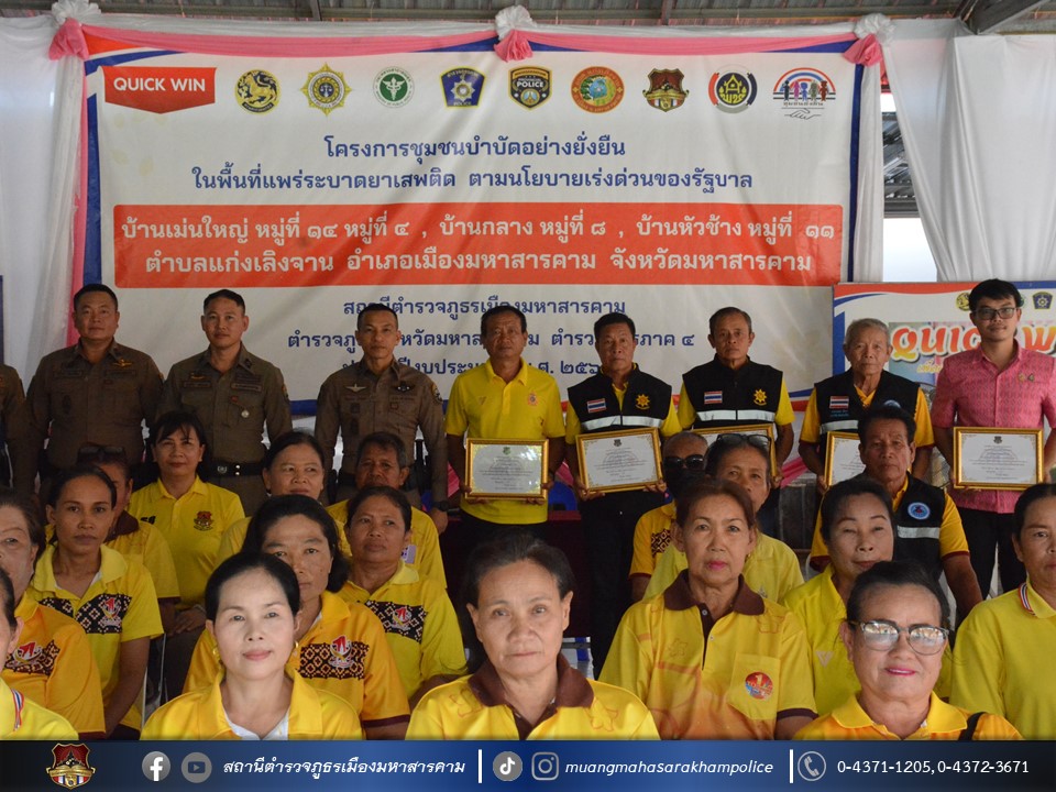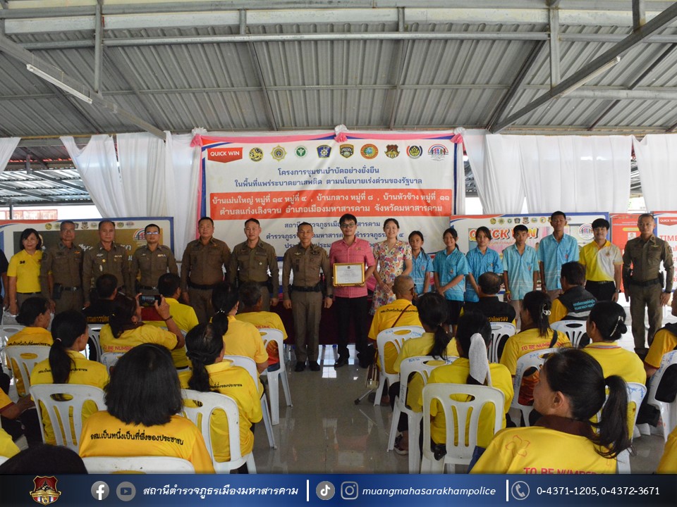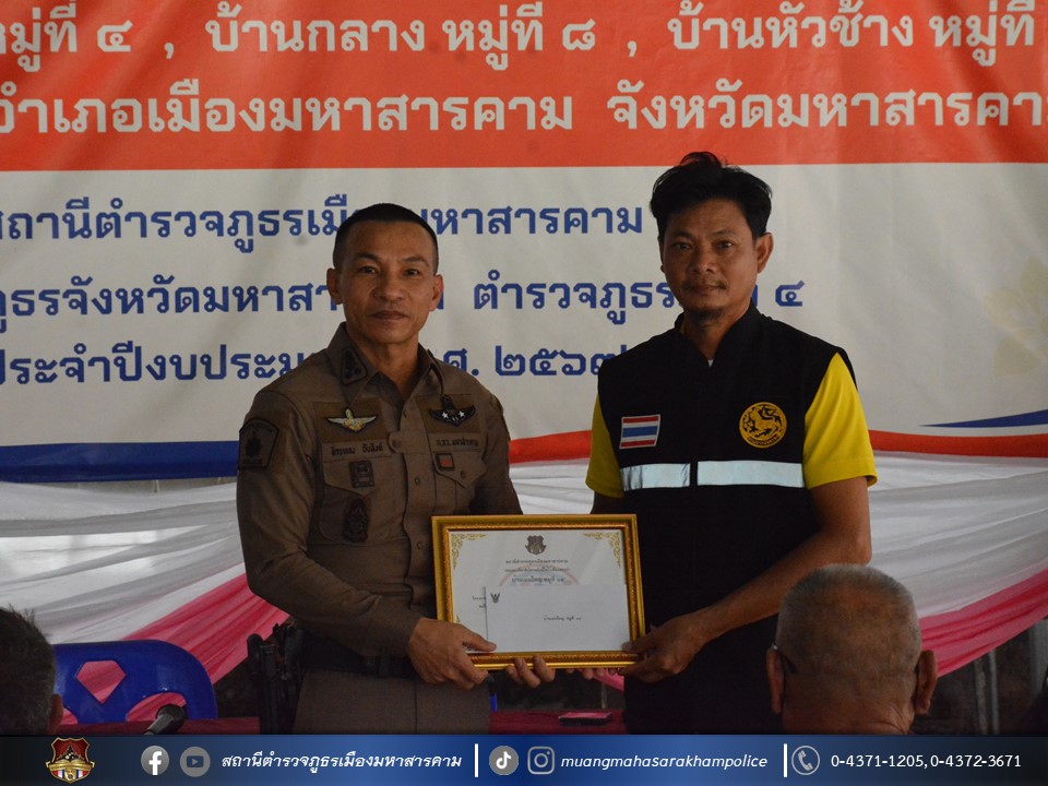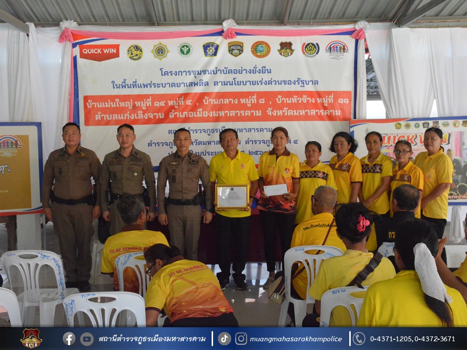 🔸พ.ต.อ.ไกรทอง ชัยสิงห์ ผกก.สภ.เมืองมหาสารคาม ได้มอบใบประกาศเกียรติคุณผู้ให้การสนับสนุนการดูแลผู้ป่วยจากการใช้ยาเสพติด ตามโครงการชุมชนบำบัดอย่างยั่งยืน ในพื้นที่แพร่ระบาดยาเสพติด ตามนโยบายเร่งด่วนของรัฐบาล ประจำปี 2567 บ้านเม่นใหญ่ หมู่ที่ 4,หมู่ที่ 14 บ้านหัวช้าง หมู่ที่ 11 และบ้านกลาง หมู่ที่ 8 ต.แก่งเลิงจาน อ.เมืองมหาสารคาม จ.มหาสารคาม ณ ศูนย์ปฏิบัติการฯ ศาลาประชาคมวัดเม่นใหญ่ ต.แก่งเลิงจาน อ.เมืองหาสารคาม จ.มหาสารคาม