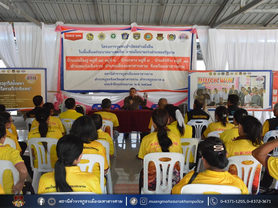 🔸พร้อมด้วยชุดปฏิบัติการชุมชนยั่งยืนฯ สภ.เมืองมหาสารคาม ลงพื้นที่พบปะผู้นำชุมชน/หมู่บ้าน คณะกรรมการคุ้ม คณะครู/บุคลากรทางการศึกษา อาสาสมัครสาธารณสุขประจำหมู่บ้าน(อสม.), ภาคีเครือข่ายฯ บ้านเม่นใหญ่ ม.4,14 บ้านหัวช้าง ม.11 บ้านกลาง ม.8 ต.แก่งเลิงจาน อ.เมืองมหาสารคาม จ.มหาสารคาม สอบถามปัญหายาเสพติดภายในชุมชน/หมู่บ้าน ติดตามผลการดูแลผู้ป่วยจากการใช้ยาเสพติด(ผู้กล้า) เพื่อเป็นมาตรการเชิงรุกแก้ปัญหายาเสพติดตามนโยบายรัฐบาล