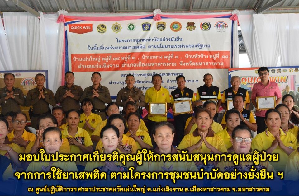 🔸พ.ต.อ.ไกรทอง ชัยสิงห์ ผกก.สภ.เมืองมหาสารคาม ได้มอบใบประกาศเกียรติคุณผู้ให้การสนับสนุนการดูแลผู้ป่วยจากการใช้ยาเสพติด ตามโครงการชุมชนบำบัดอย่างยั่งยืน ในพื้นที่แพร่ระบาดยาเสพติด ตามนโยบายเร่งด่วนของรัฐบาล ประจำปี 2567 บ้านเม่นใหญ่ หมู่ที่ 4,หมู่ที่ 14 บ้านหัวช้าง หมู่ที่ 11 และบ้านกลาง หมู่ที่ 8 ต.แก่งเลิงจาน อ.เมืองมหาสารคาม จ.มหาสารคาม ณ ศูนย์ปฏิบัติการฯ ศาลาประชาคมวัดเม่นใหญ่ ต.แก่งเลิงจาน อ.เมืองหาสารคาม จ.มหาสารคาม