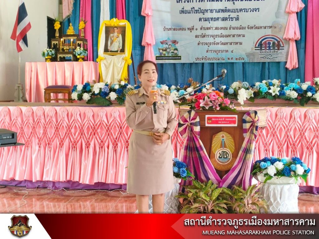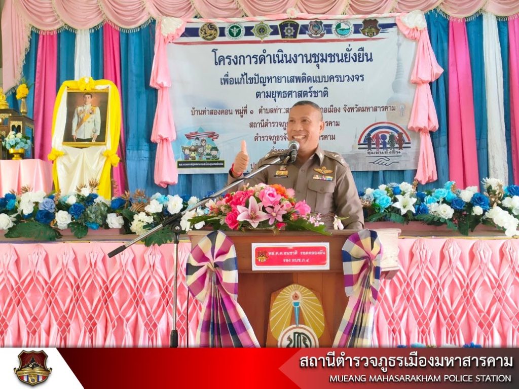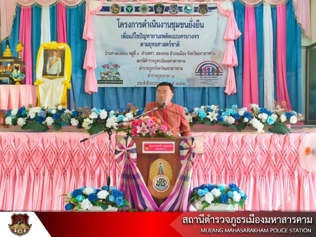 เมื่อวันที่ 22 กรกฎาคม 2566 เวลา 09.00 น. พล.ต.ต.ธนชาติ รอดคลองตัน รอง ผบช.ภ.4 พร้อมด้วยคณะกรรมการตรวจประเมินติดตามโครงการชุมชนยั่งยืน ตำรวจภูธรภาค 4 ได้เดินทางมาตรวจประเมินโครงการชุมชนยั่งยืน เพื่อแก้ไขปัญหายาเสพติด แบบครบวงจรตามยุทธศาสตร์ชาติ สภ.เมืองมหาสารคาม ณ บ้านท่าสองคอน หมู่ที่ 1 ต.ท่าสองคอน อ.เมืองมหาสารคาม จ.มหาสารคาม โดยมี นายนพสิทธิ์ อุดมสุวรรณกุล รองผู้ว่าราชการจังหวัดมหาสารคาม, นายพรสิทธิ์ ทวยนันท์ รองนายแพทย์สาธารณสุขจังหวัดมหาสารคาม, พ.ต.อ.ธวัชชัย สัตยพัฒน์ รอง ผบก.ภ.จว.มหาสารคาม(ปส.1), นายประกอบ โพธิ์ศรี ปลัดอาวุโสอำเภอเมืองมหาสารคาม, นายทรงวิทย์ ศรีคำสาธารณสุขอำเภอเมืองมหาสารคาม, นางสุกัญญา วัฒนประไพจิตร ผู้อำนวยการโรงพยาบาลส่งเสริมสุขภาพตำบลบ้านหนองแวง, นางสาวสุวิมล เจ้าแก่นแก้ว พัฒนาการอำเภอเมืองมหาสารคาม, นายสุรชิต แก้วหะนาม นายกองค์การบริหารส่วนตำบลท่าสองคอน, นายสุภาพ จูมพันธุ์ กำนันตำบลท่าสองคอน, นางสุกัญญา วัฒนประไพจิตร ผู้อำนวยการโรงพยาบาลส่งเสริมสุขภาพตำบลบ้านหนองแวง, นางฉวีวรรณ จันทรักษ์ ผู้อำนวยการโรงพยาบาลส่งเสริมสุขภาพตำบลบ้านโนนแต้, นายวินัย ดวงภูเมฆ รองผู้อำนวยการโรงเรียนบ้านท่าสองคอน, พ.ต.อ.ไกรทอง ชัยสิงห์ผกก.สภ.เมืองมหาสารคาม, พ.ต.ท.กฤษฎา นิติพจน์ รอง ผกก.สส.สภ.เมืองมหาสารคาม, พ.ต.ท.หัสดีวิช ศรีกำพล รอง ผกก.ป.สภ.เมืองมหาสารคาม, คณะครูโรงเรียนบ้านท่าสองคอน ผู้ใหญ่บ้าน ผู้นำชุมชน ชาวบ้านท่าสองคอน พร้อมด้วยข้าราชการตำรวจ ชุดปฏิบัติการชุมชนยั่งยืน สภ.เมืองมหาสารคาม ร่วมต้อนรับ