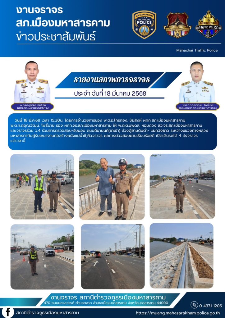 พ.ต.ต.นพดล หอมดวง สว.จร.สภ.เมืองมหาสารคาม และจราจรร่วม ว.4 ร่วมการตรวจสอบ-รับมอบ ถนนถีนานนท์(ขาเข้า) ช่วงตู้ยามดินดำ- แยกวังยาว ระหว่างแขวงทางหลวงมหาสารคากับผู้รับเหมางานก่อสร้างผนังแม่น้ำชี, ผิวจราจร ผลการตรวจสอบผ่านเรียบร้อยดี เปิดเดินรถได้ 4 ช่องจราจร แต่เวลานี้