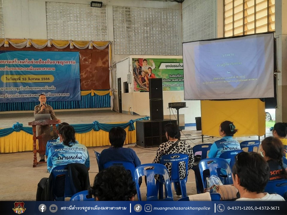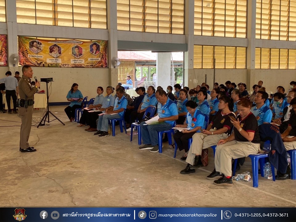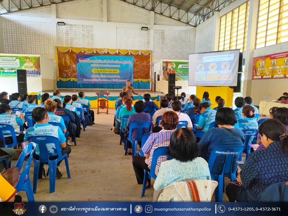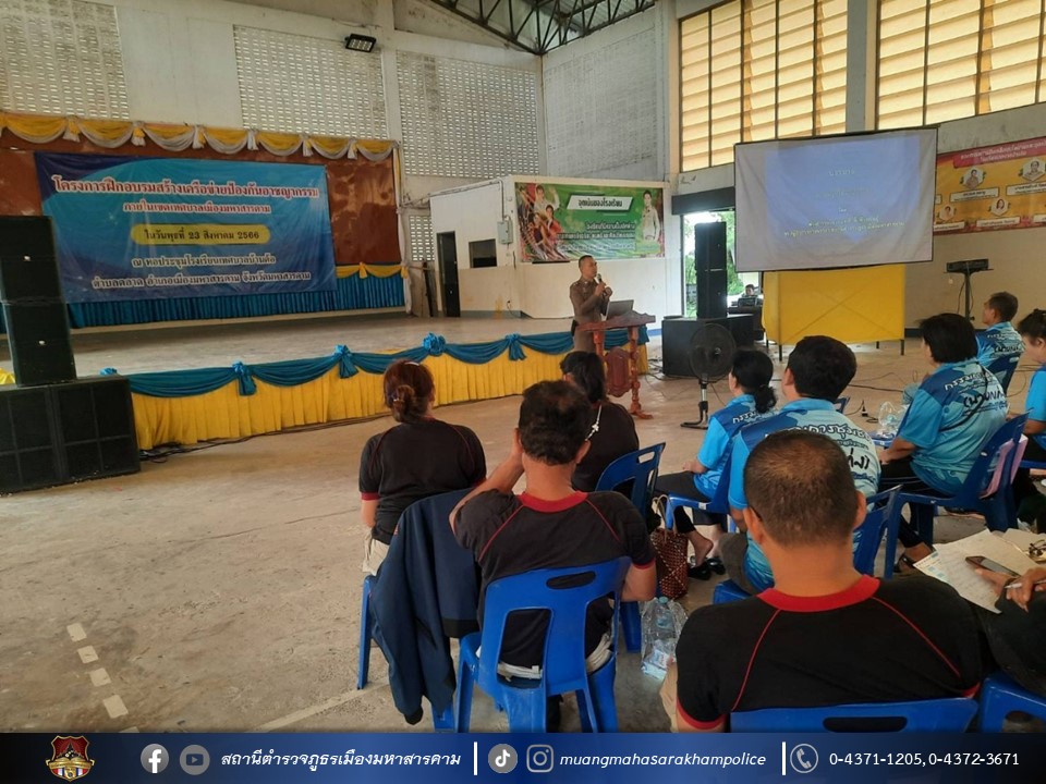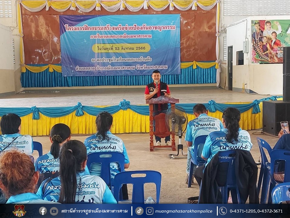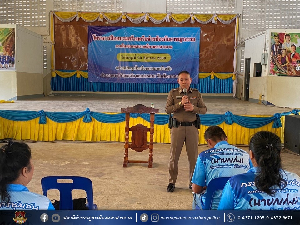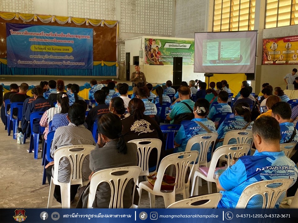 เมื่อวันที่ 23 สิงหาคม 2566 เวลา 08.00 – 16.30 น. พ.ต.อ.ไกรทอง ชัยสิงห์ ผกก.สภ.เมืองมหาสารคาม, พ.ต.ท.เทอดศักดิ์ พีระพันธุ์ รอง ผกก.จร.สภ.เมืองมหาสารคาม, พ.ต.ท.หัสดีวิช ศรีกำพล รอง ผกก.ป.สภ.เมืองมหาสารคาม, พ.ต.ท.กฤษฎา นิติพจน์ รอง ผกก.สส.สภ.เมืองมหาสารคาม, พ.ต.ท.กิตภากร ภูคำสอน สวป.สภ.เมืองมหาสารคาม, พ.ต.ท.ชัยยุทธ รอดเวียง สว.จร.สภ.เมืองมหาสารคาม, พ.ต.ท.สุวันชัย สีทา สว.สส.สภ.เมืองมหาสารคาม พร้อมด้วยข้าราชการตำรวจชุด ชมส. / ชุดนาคาพิทักษ์ฯ / เป็นวิทยากรฝึกอบรม ตามโครงการฝึกอบรมสร้างเครือข่ายป้องกันอาชญากรรมภายในเขตเทศบาลเมืองมหาสารคาม มีประชาชนร่วมโครงการฝึกอบรมฯ จำนวน 100 คน ณ หอประชุมโรงเรียนเทศบาลบ้านค้อ ต.ตลาด อ.เมืองมหาสารคาม จ.มหาสารคาม โดยได้บรรยายให้ความรู้ประชาชนผู้ร่วมโครงการฝึกอบรมสร้างเครือข่าย ดังนี้