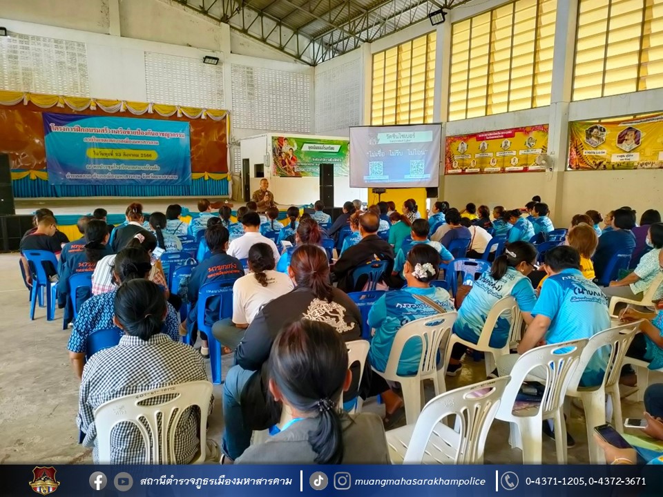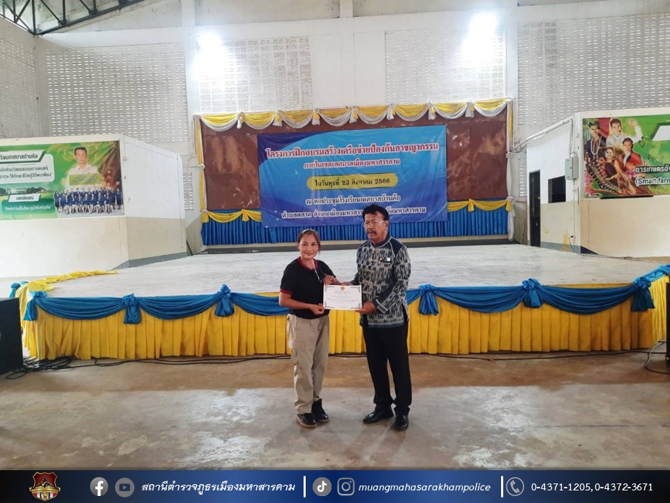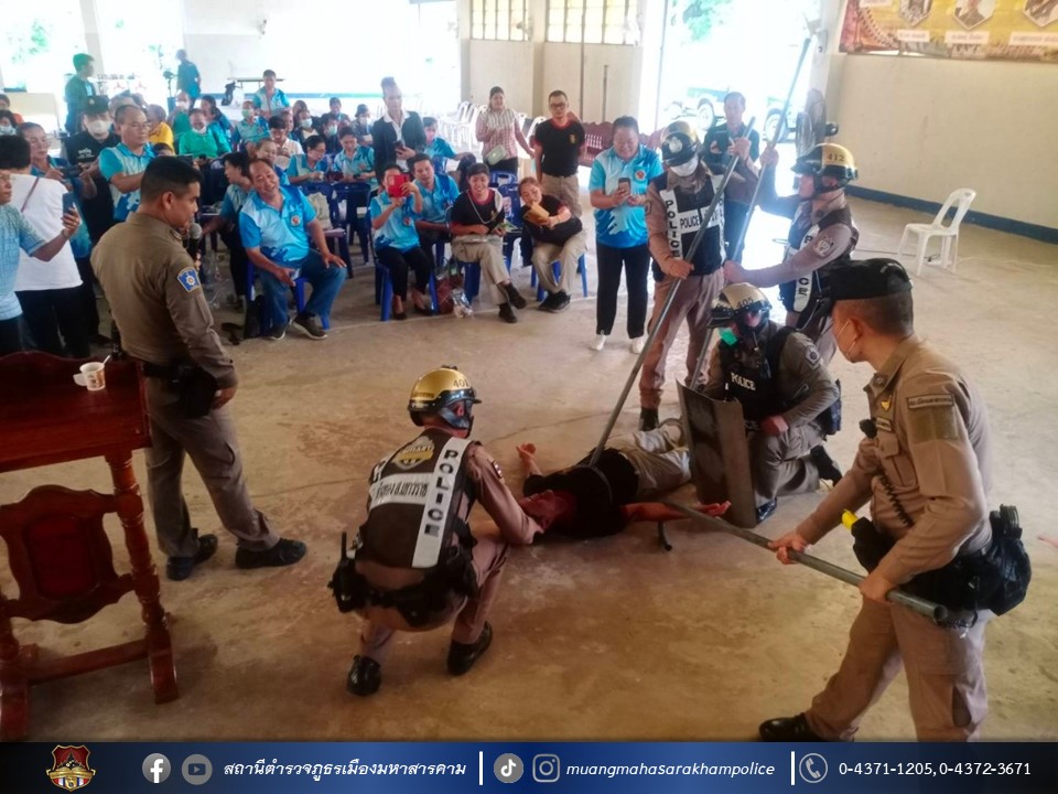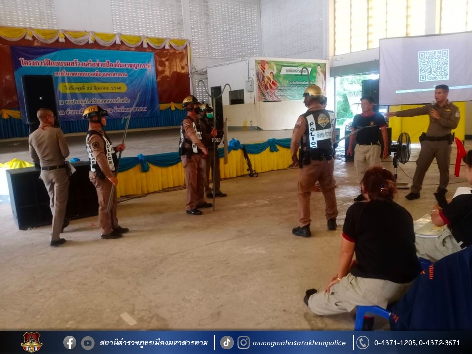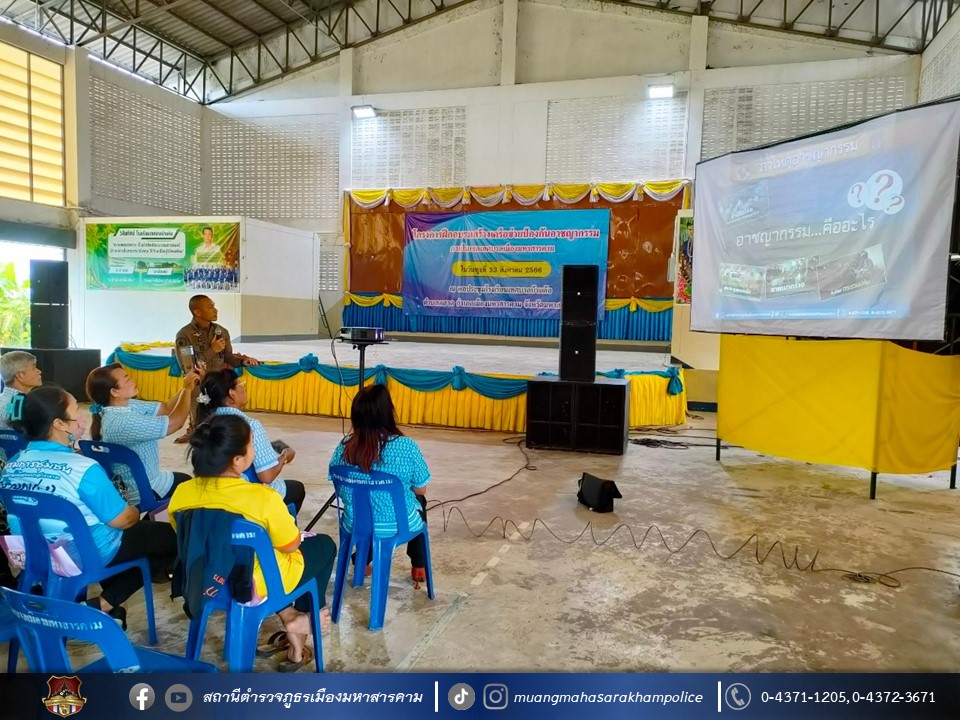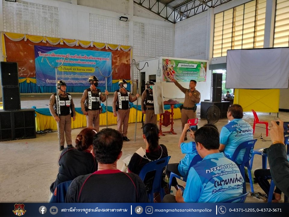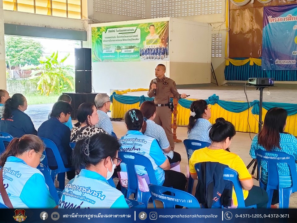 เมื่อวันที่ 23 สิงหาคม 2566 เวลา 08.00 – 16.30 น. พ.ต.อ.ไกรทอง ชัยสิงห์ ผกก.สภ.เมืองมหาสารคาม, พ.ต.ท.เทอดศักดิ์ พีระพันธุ์ รอง ผกก.จร.สภ.เมืองมหาสารคาม, พ.ต.ท.หัสดีวิช ศรีกำพล รอง ผกก.ป.สภ.เมืองมหาสารคาม, พ.ต.ท.กฤษฎา นิติพจน์ รอง ผกก.สส.สภ.เมืองมหาสารคาม, พ.ต.ท.กิตภากร ภูคำสอน สวป.สภ.เมืองมหาสารคาม, พ.ต.ท.ชัยยุทธ รอดเวียง สว.จร.สภ.เมืองมหาสารคาม, พ.ต.ท.สุวันชัย สีทา สว.สส.สภ.เมืองมหาสารคาม พร้อมด้วยข้าราชการตำรวจชุด ชมส. / ชุดนาคาพิทักษ์ฯ / เป็นวิทยากรฝึกอบรม ตามโครงการฝึกอบรมสร้างเครือข่ายป้องกันอาชญากรรมภายในเขตเทศบาลเมืองมหาสารคาม มีประชาชนร่วมโครงการฝึกอบรมฯ จำนวน 100 คน ณ หอประชุมโรงเรียนเทศบาลบ้านค้อ ต.ตลาด อ.เมืองมหาสารคาม จ.มหาสารคาม โดยได้บรรยายให้ความรู้ประชาชนผู้ร่วมโครงการฝึกอบรมสร้างเครือข่าย ดังนี้
