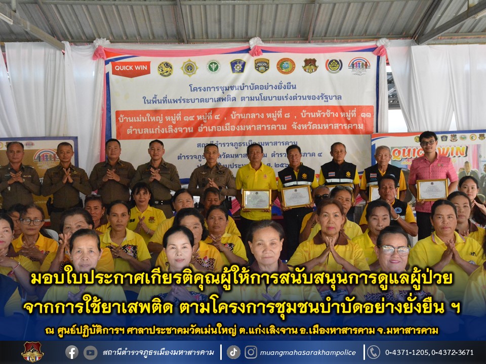 พ.ต.อ.ไกรทอง ชัยสิงห์ ผกก.สภ.เมืองมหาสารคาม ได้มอบใบประกาศเกียรติคุณผู้ให้การสนับสนุนการดูแลผู้ป่วยจากการใช้ยาเสพติด ตามโครงการชุมชนบำบัดอย่างยั่งยืน